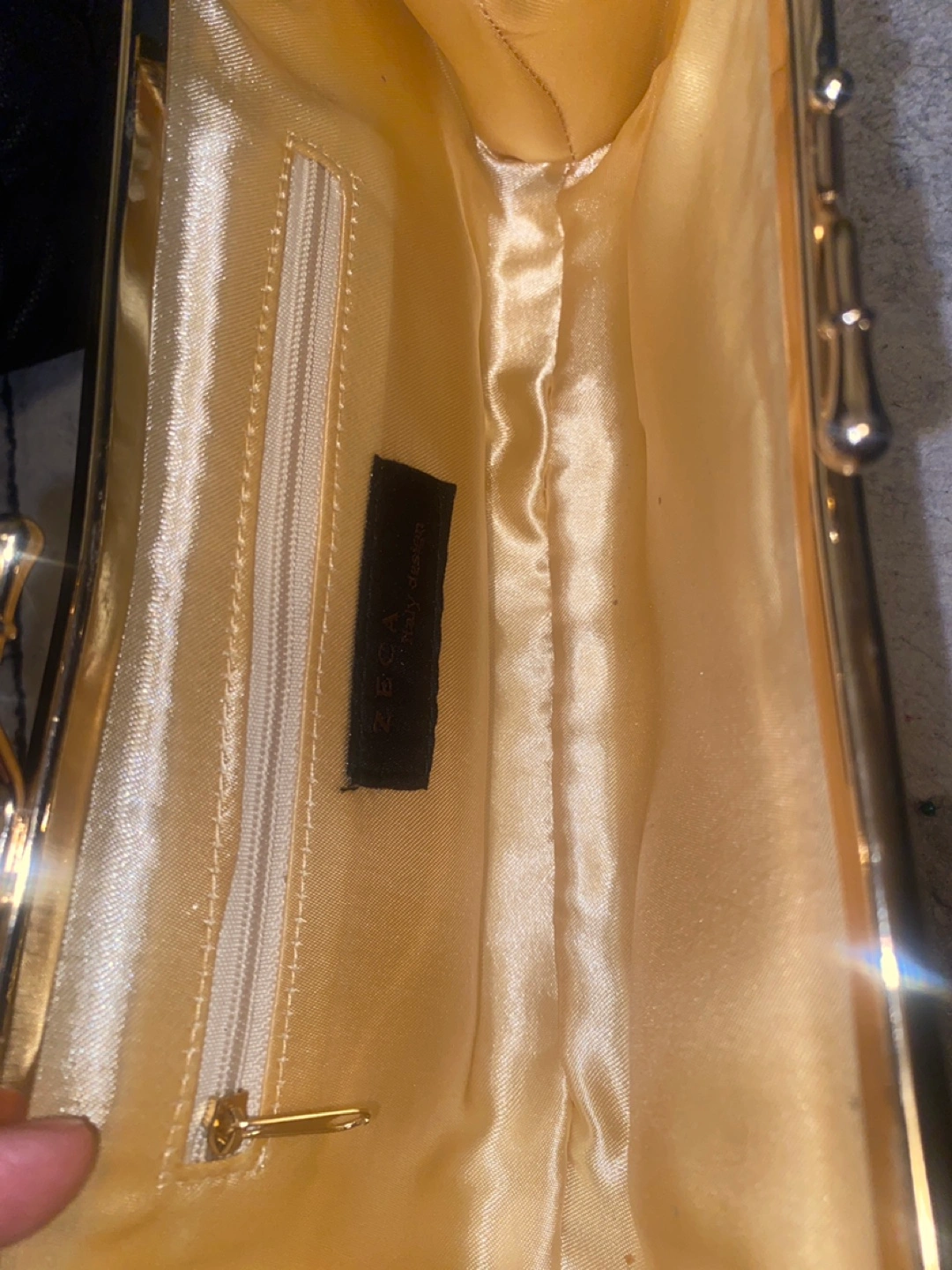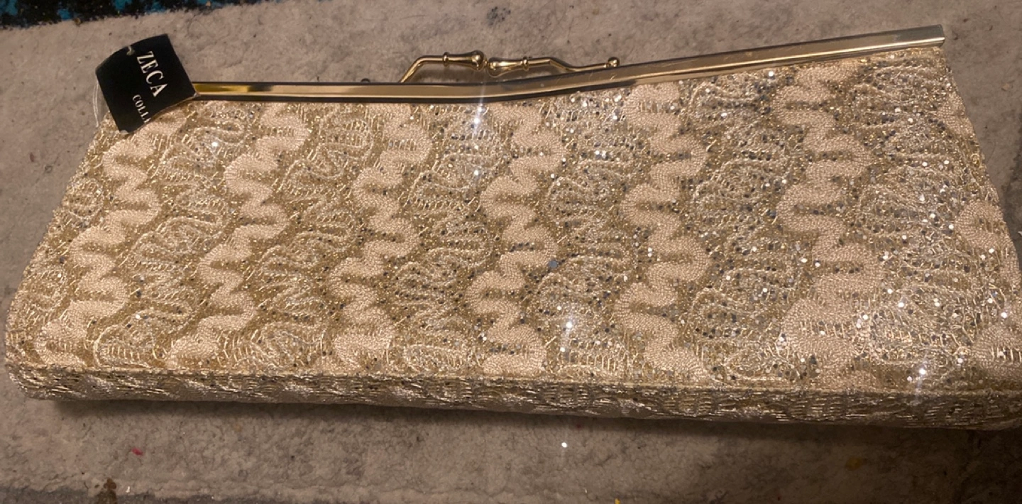 881Beautiful gold sparkly clutch. Features a gold clasp and satin interior. Interior zippered pocket.