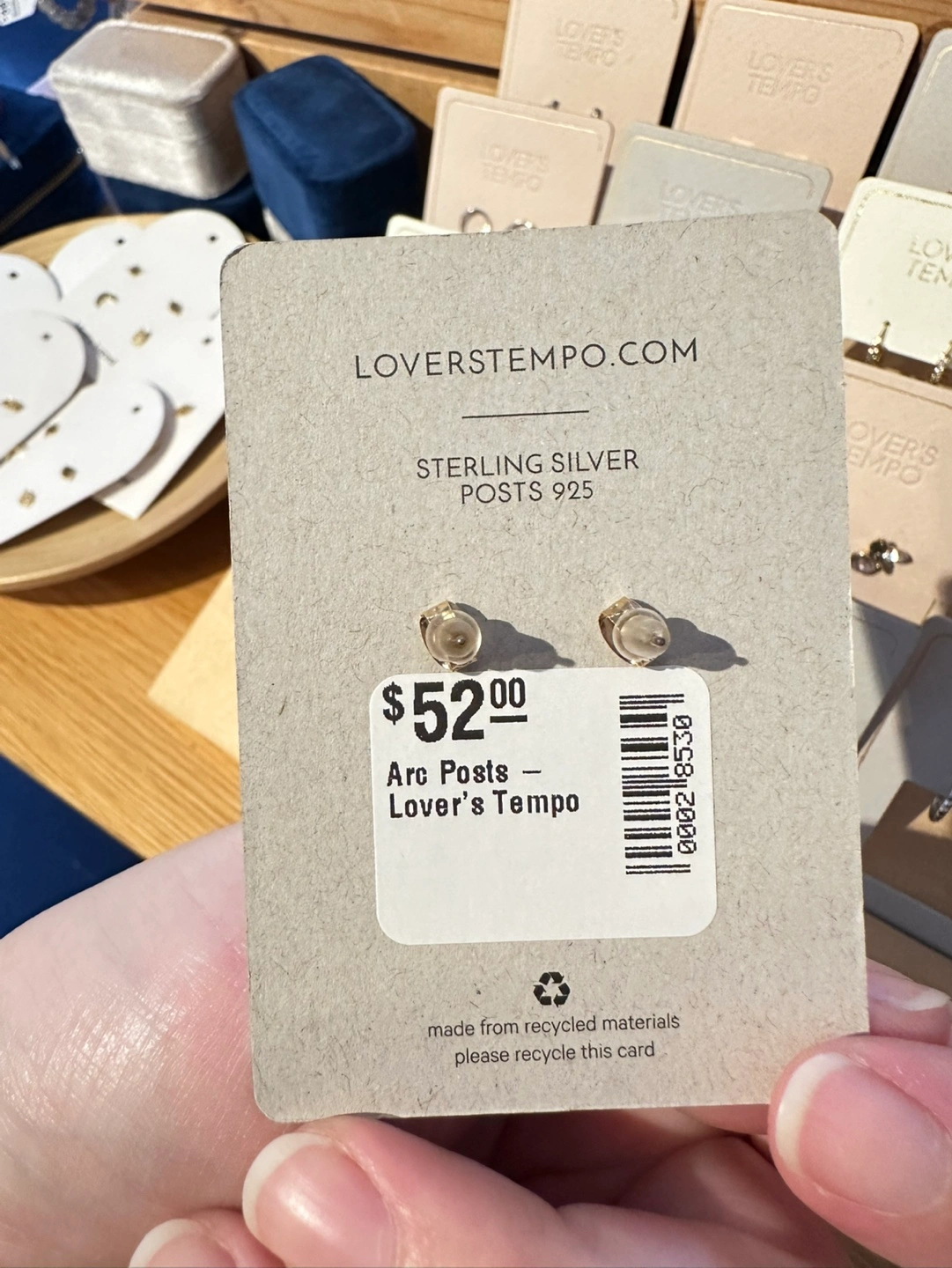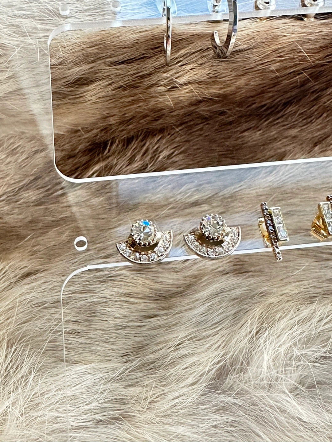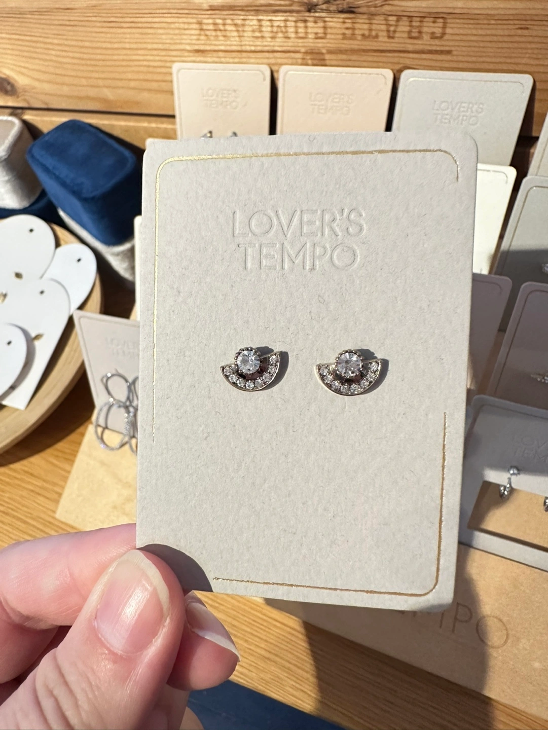 Modern and vintage styles blend in this subtle half-circle design from Lover’s Tempo. Lightweight, elegant sparkle for any outfit. Cubic zirconia stones in an arch around a centre stone. Recently cleaned and sanitized. In perfect condition. Sterling silver posts. Measures about 1cm across.