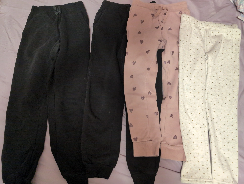 Four pairs of girls' size (7-8) joggers and warm legging. Two black pairs, one dusty rose with hearts, one cream with gold hearts warm legging. Good used condition.