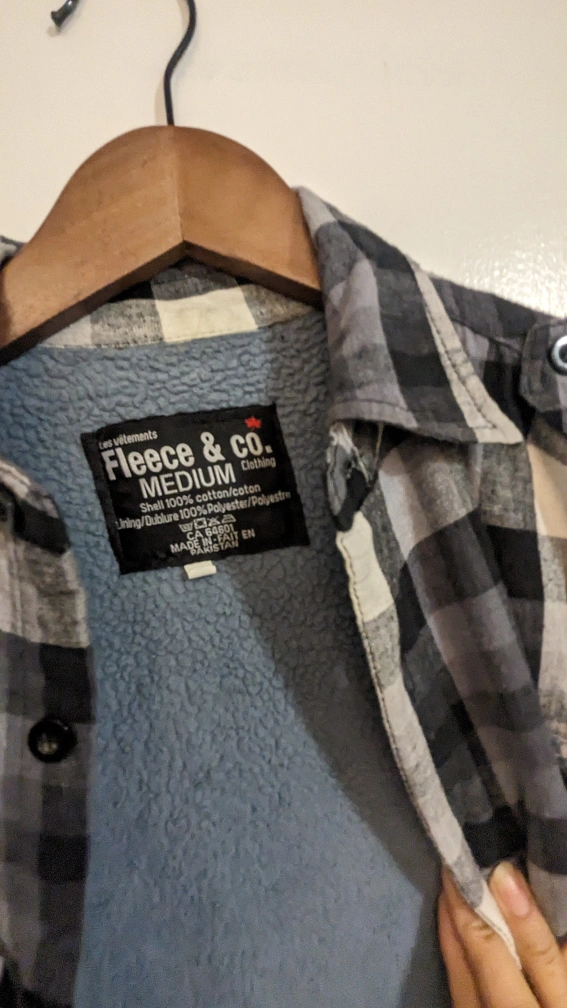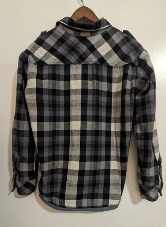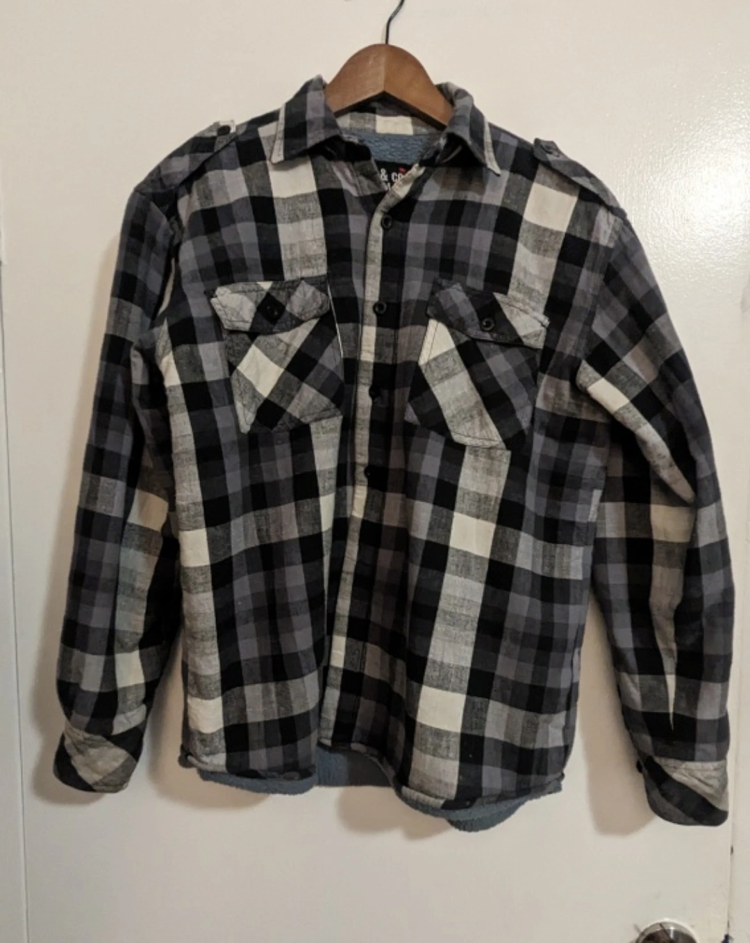 Men's medium-sized flannel shirt. Black, grey and white plaid. Fleece-lined. Long sleeves. Two chest pockets.