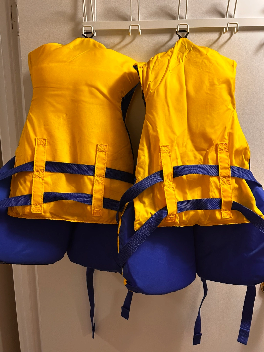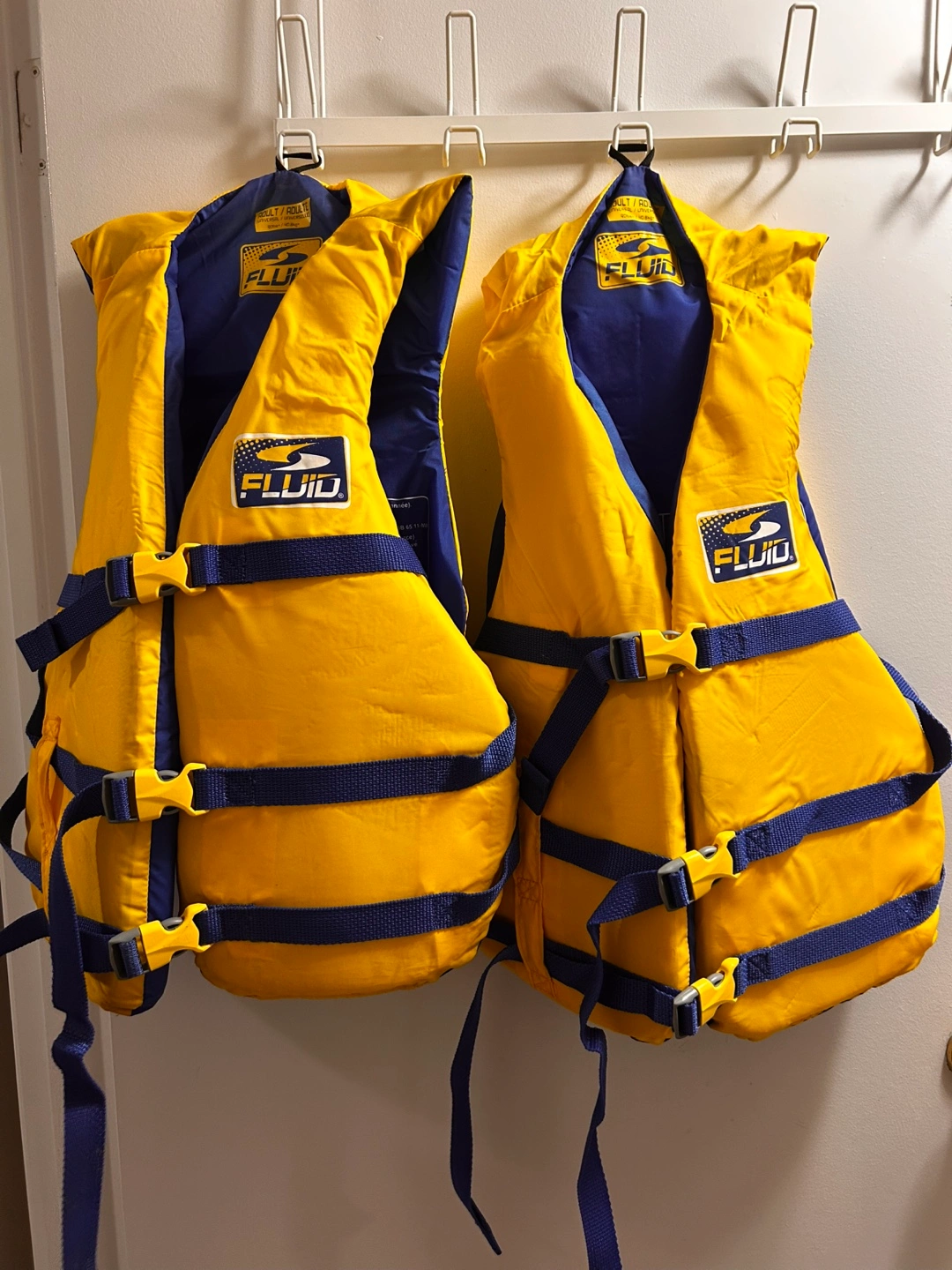 Pair of yellow and blue Fluid brand life jackets. Three-belt design. Good for boating or water sports.