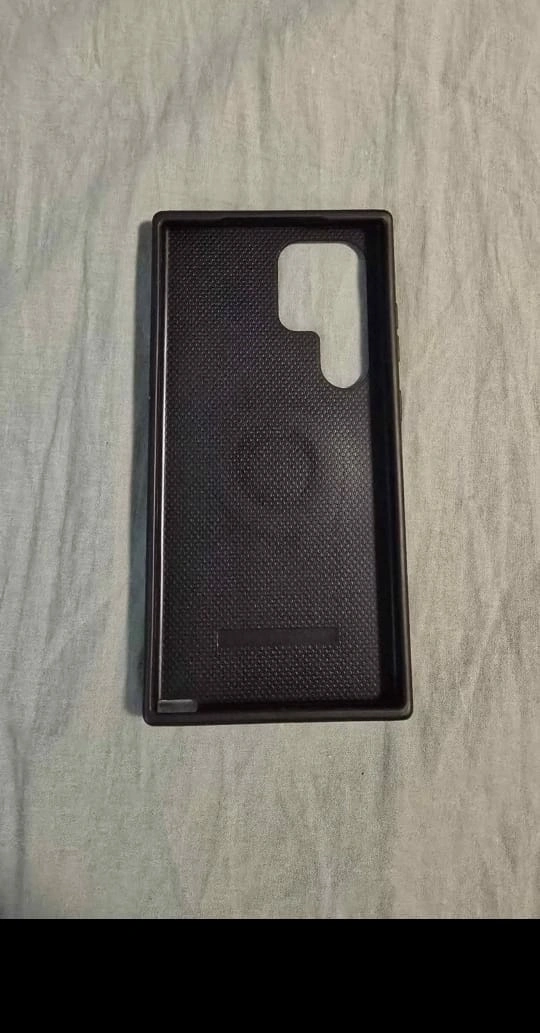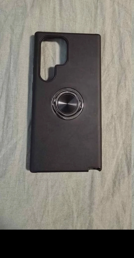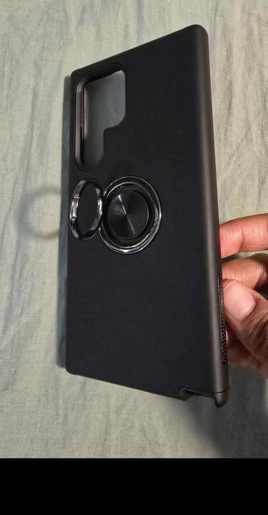 Black phone case for Samsung Galaxy S24 ultra . Features a rotating ring holder. Protective and stylish.