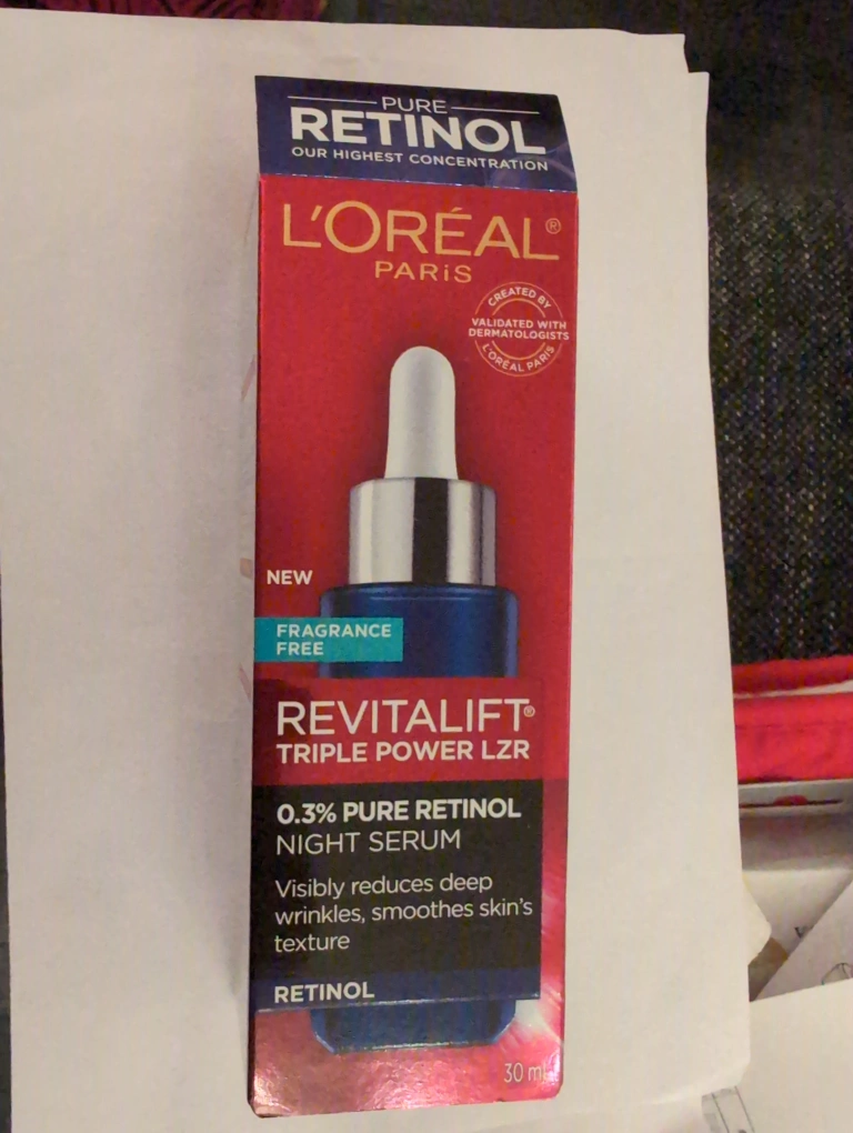 New, unopened, fragrance-free night serum. Reduces deep wrinkles, smooths skin texture. 30 ml bottle. Pure retinol, highest concentration.