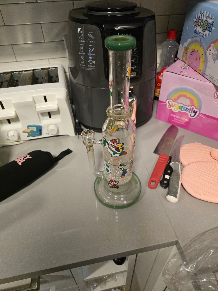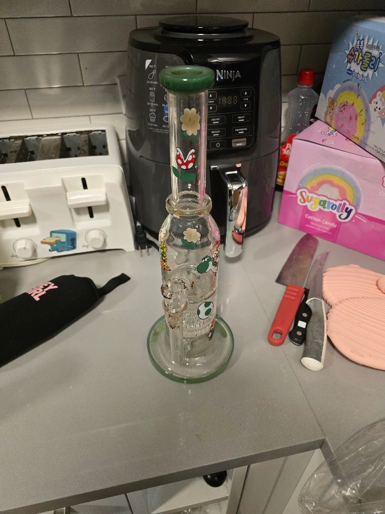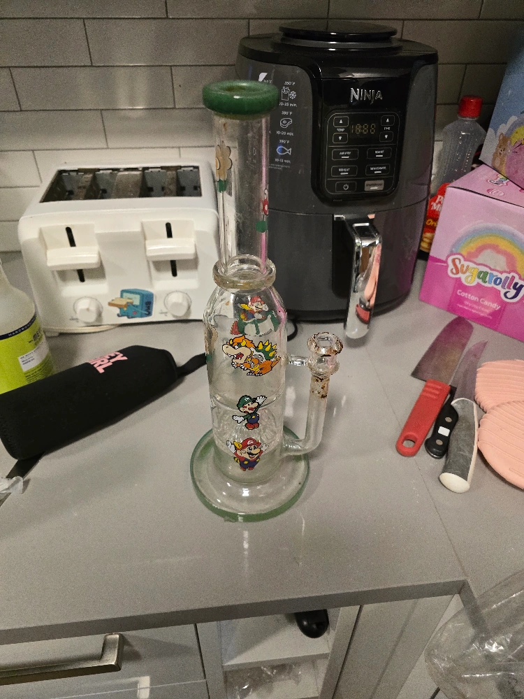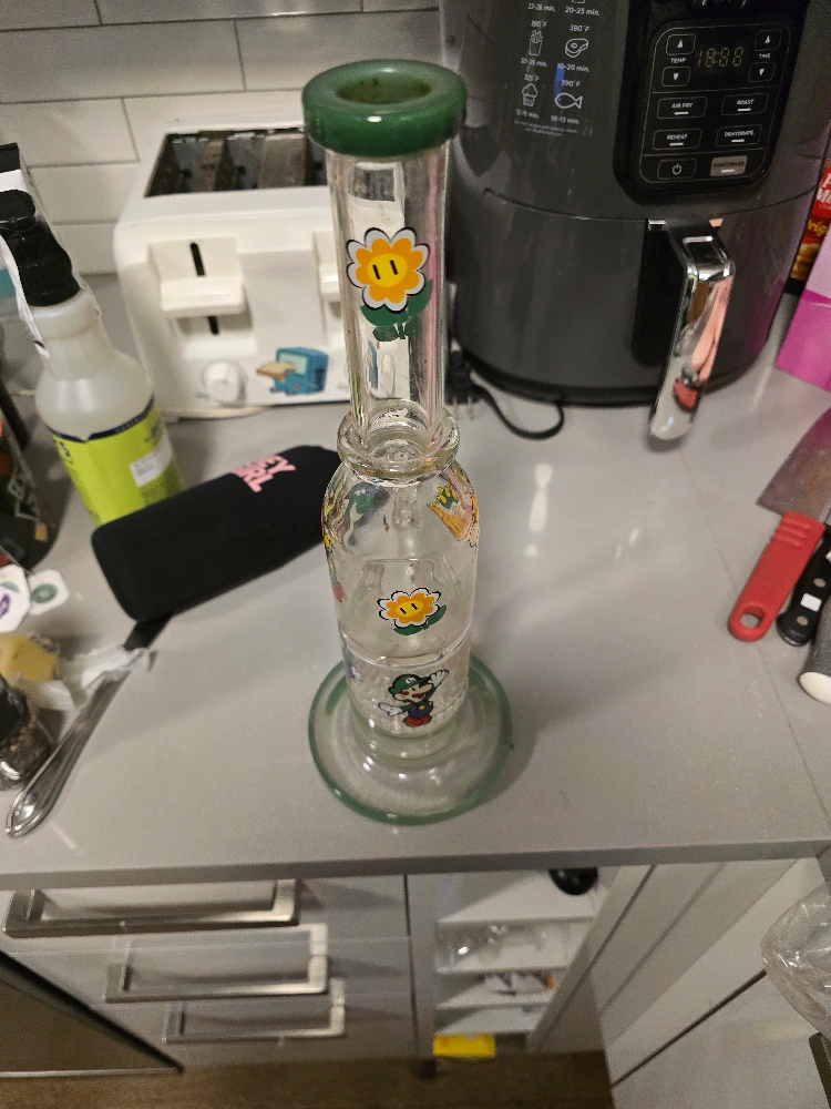 Unique glass water pipe. Features Super Mario characters. Green top. Used condition. Smoke accessories.