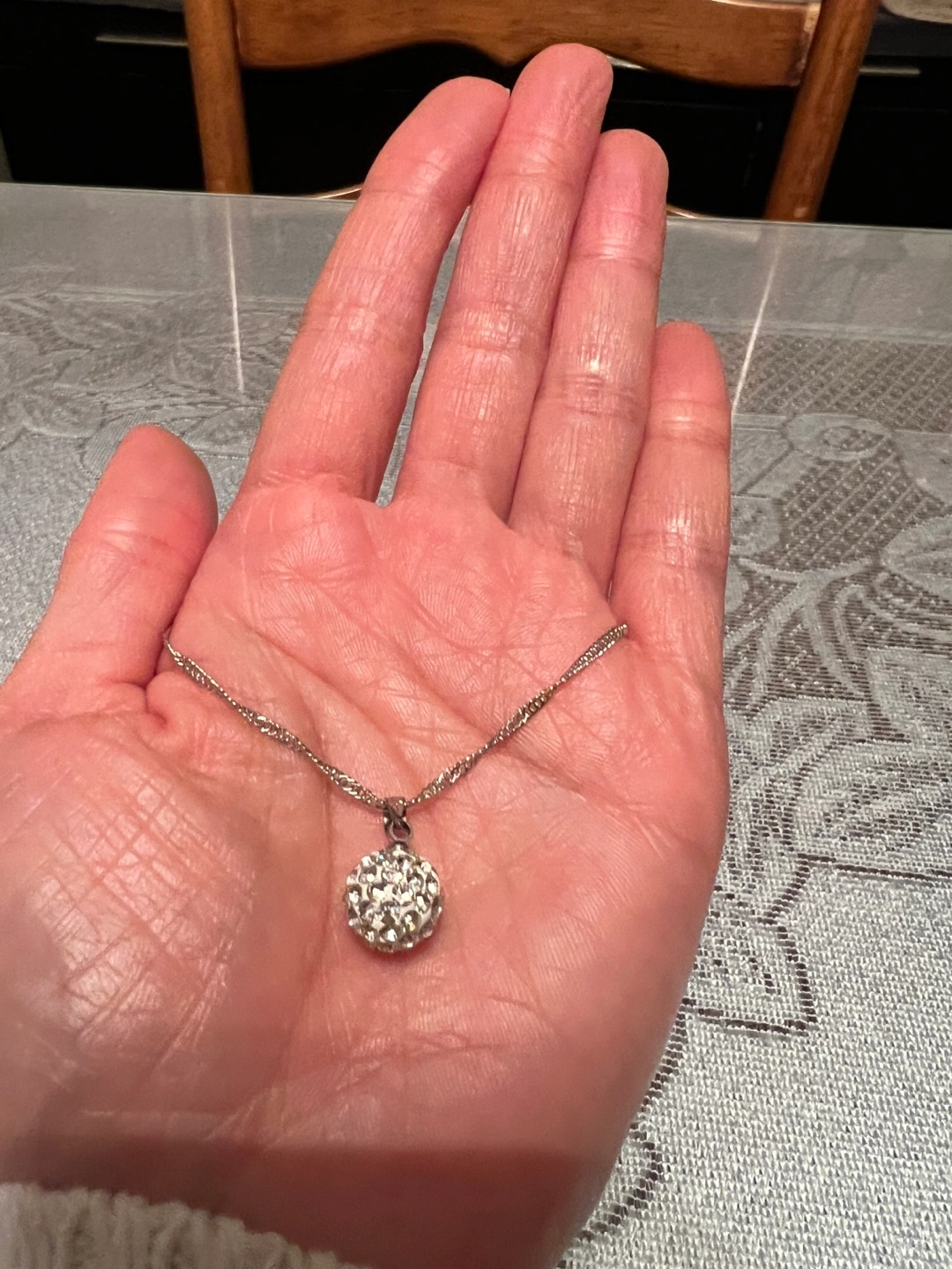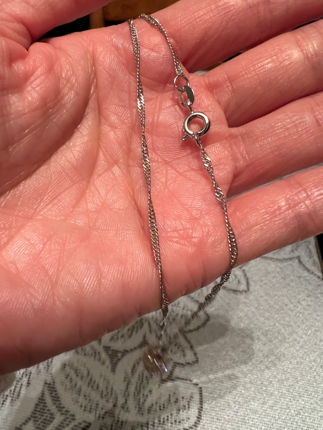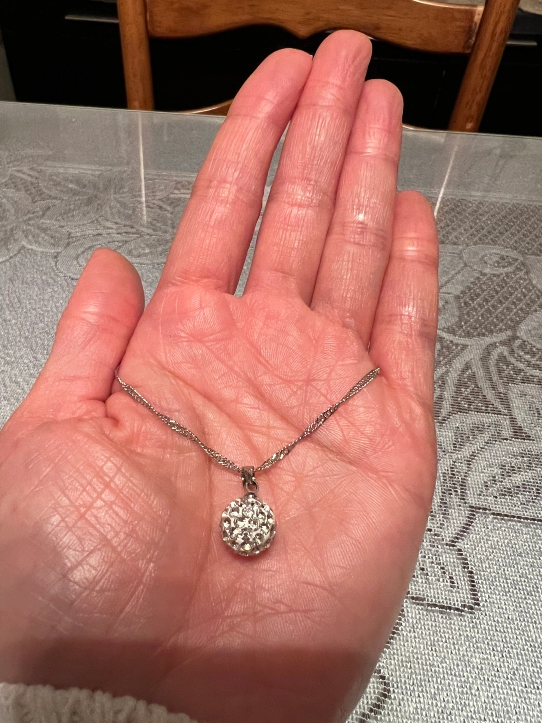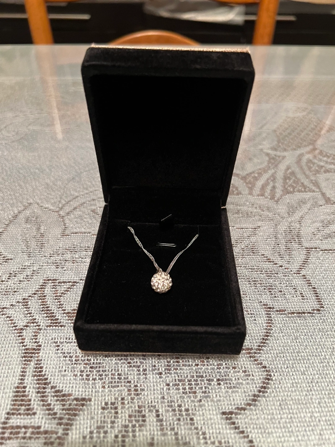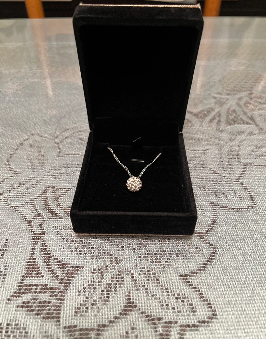 Double-twisted silver chain necklace that features a small, sparkly ball pendant. Comes in a jewellery box. Elegant and simple; perfect gift for that special someone or for yourself :)