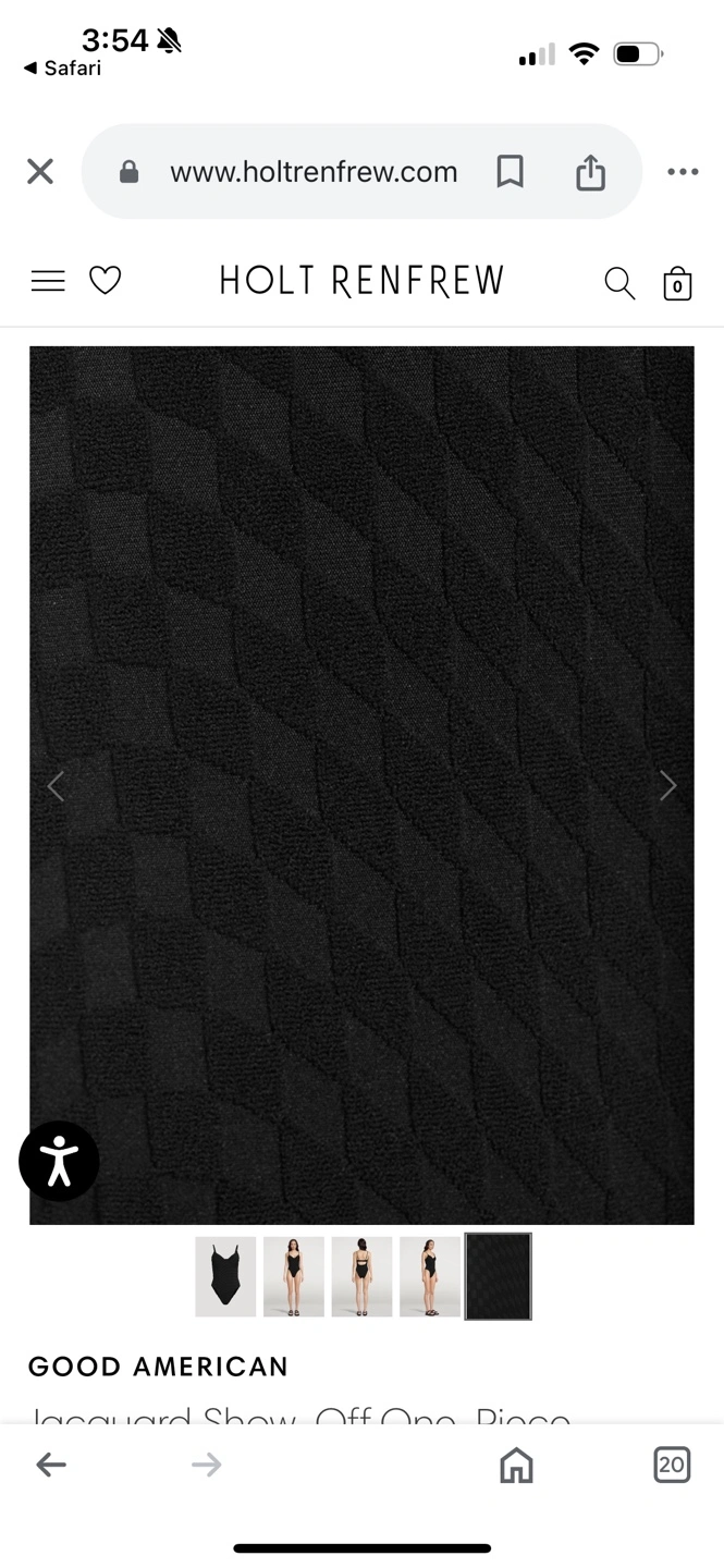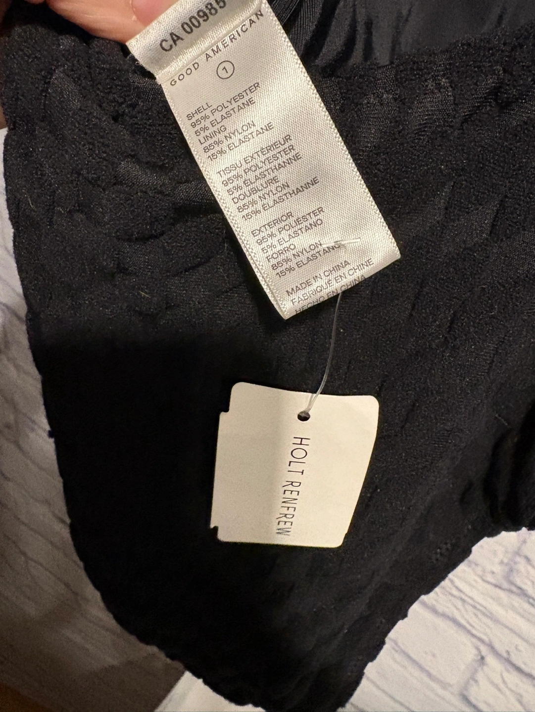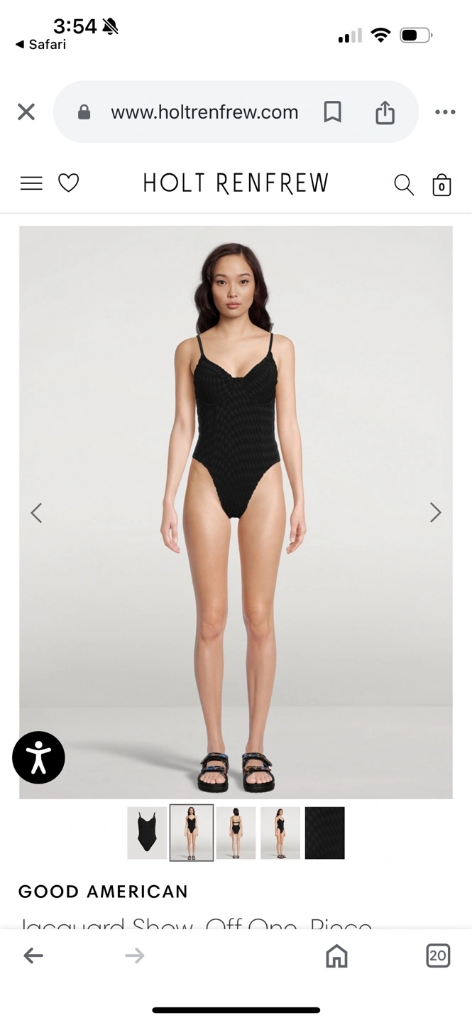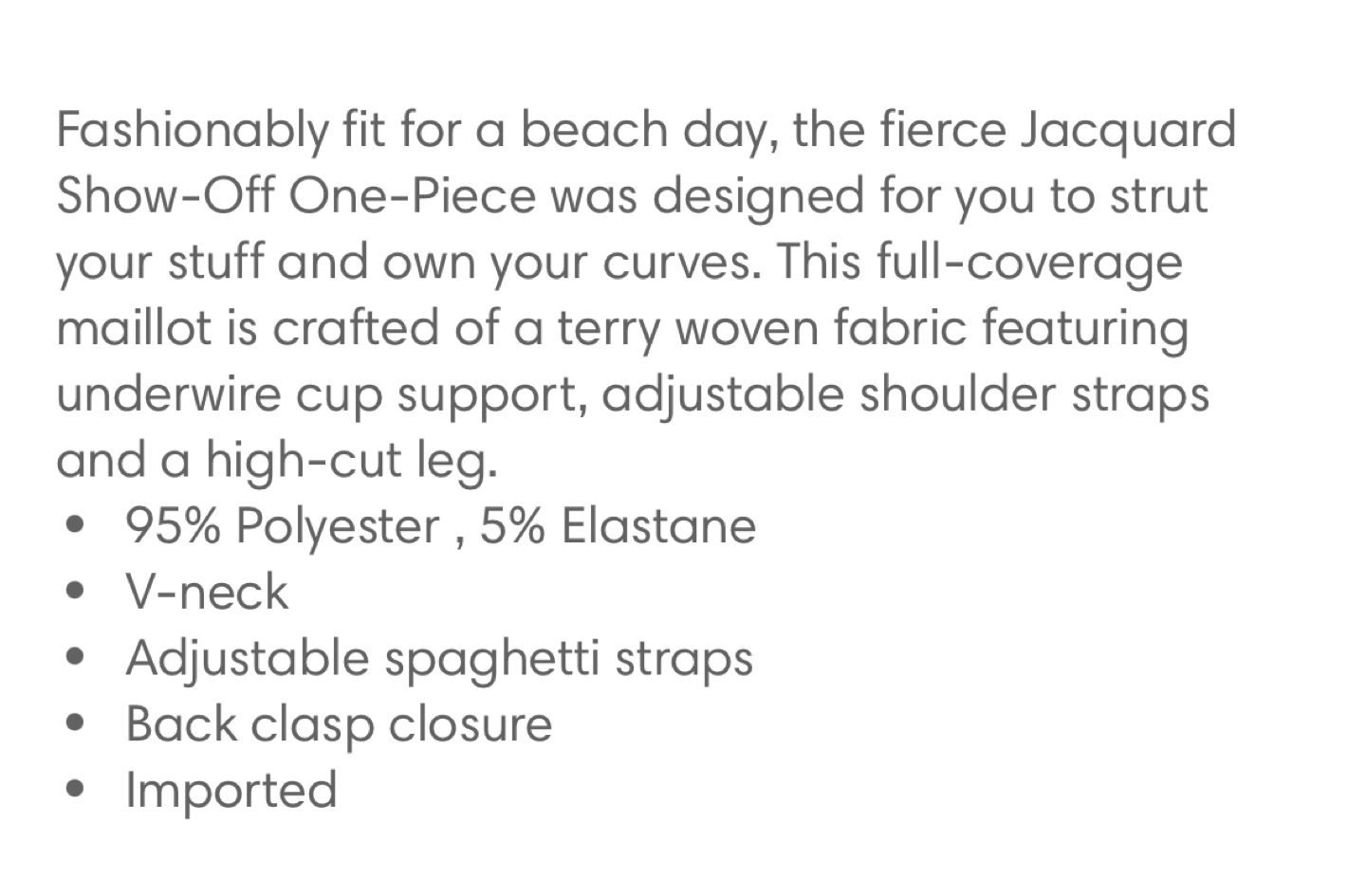 Black one-piece swimsuit. Features V-neck, adjustable spaghetti straps, and back clasp closure. High-cut leg. Underwire support. Terry woven fabric. 95% polyester, 5% elastane. Refer to size guide as GA sizing is unique. Retail was $165. Pick up only.