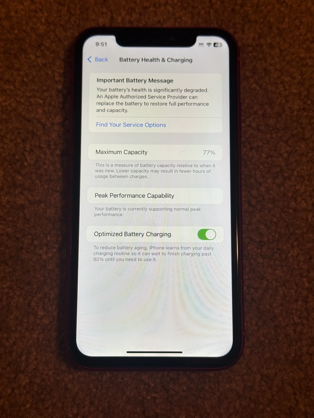 Great condition iPhone, no scratches on screen, had a protector the whole time, just took it off. No problems at all, and works great. Battery has been replaced once and the 77% is not accurate as it feels more. Unlocked - any provider will work