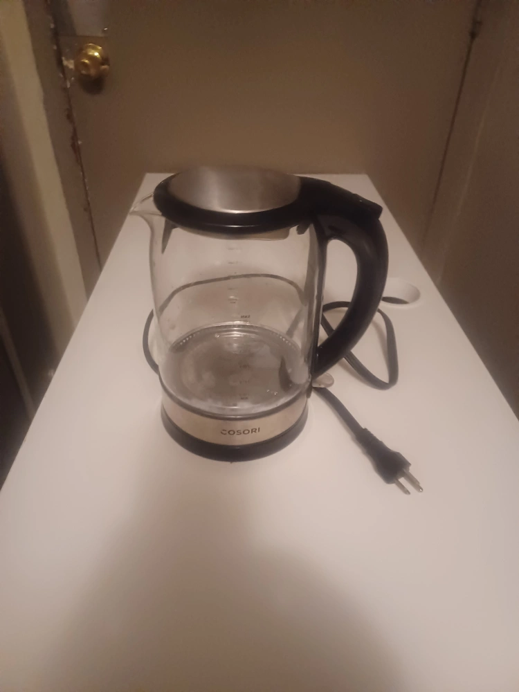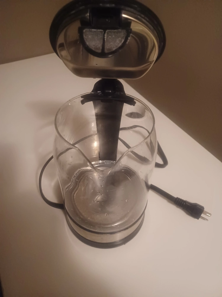 229Glass electric kettle. Black handle and stainless steel accents. Used condition. Includes cord.