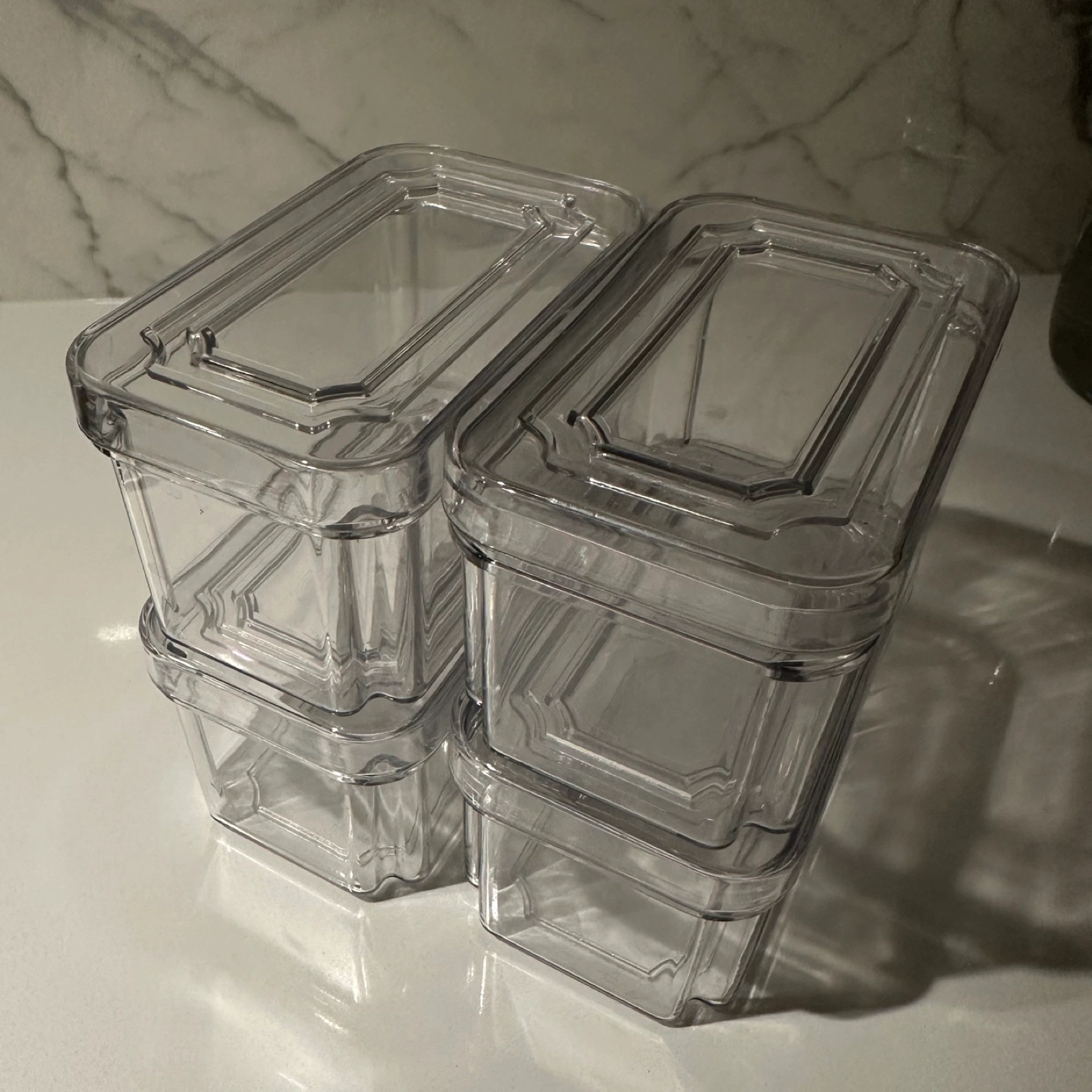 Four clear plastic containers with lids. Stackable design. Great for organizing small items.