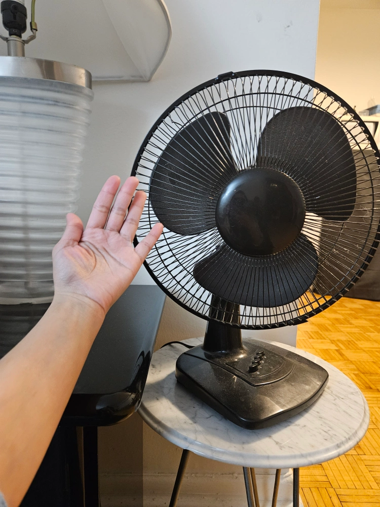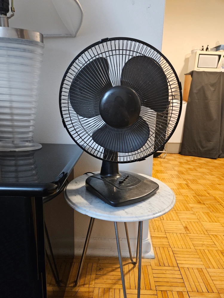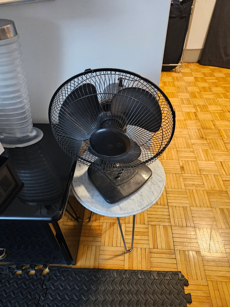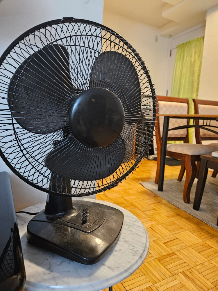 207Small black desk fan. Three blades. Oscillates. Good for personal use.