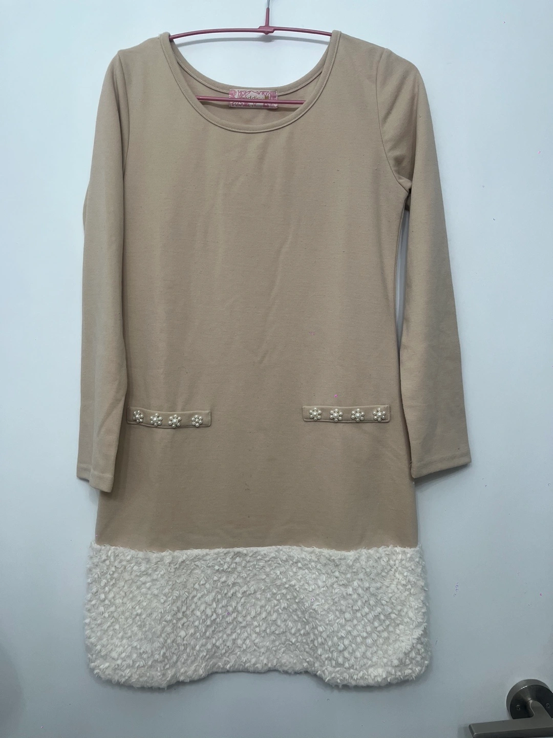 Adorable beige long-sleeved mini dress. Features a cream-coloured faux fur hem and pearl detailing on the pockets. Long sleeves and a round neckline. Perfect for fall or winter.