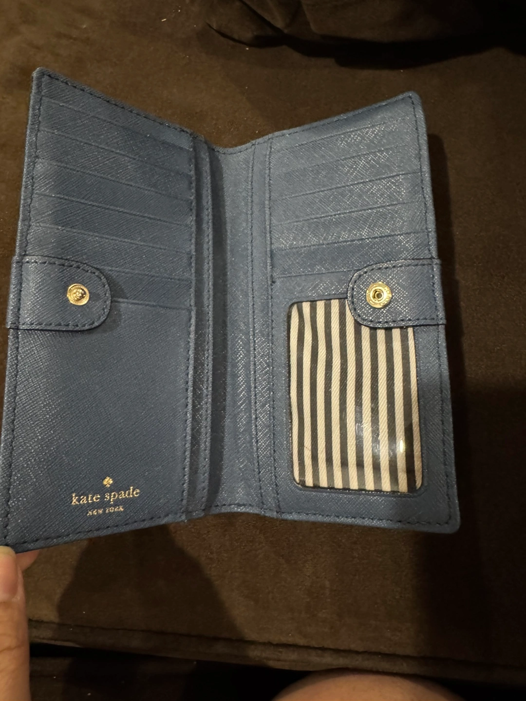 Kate Spade Darcy Slim Bifold wallet. Multiple card slots and a zippered compartment. Features the signature Kate Spade logo. Great for everyday use.