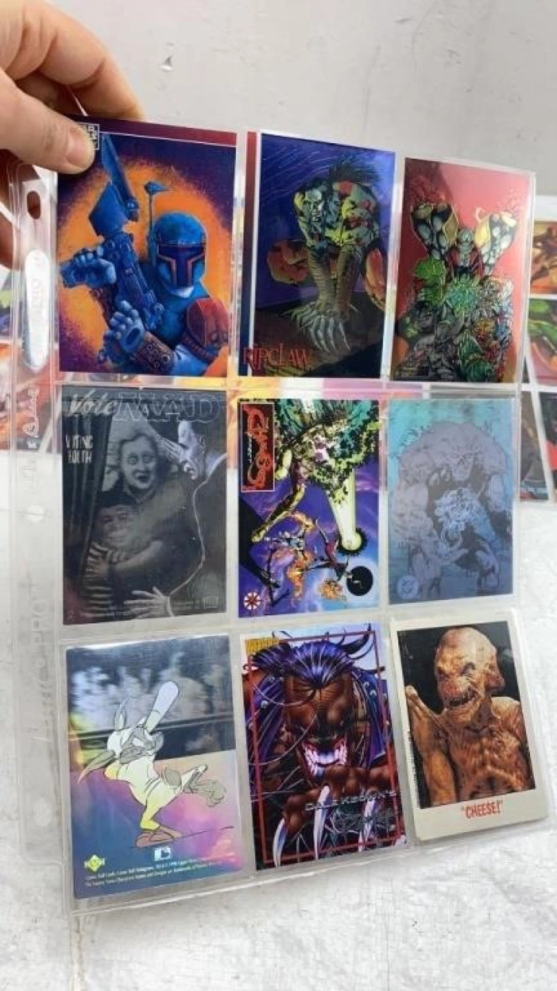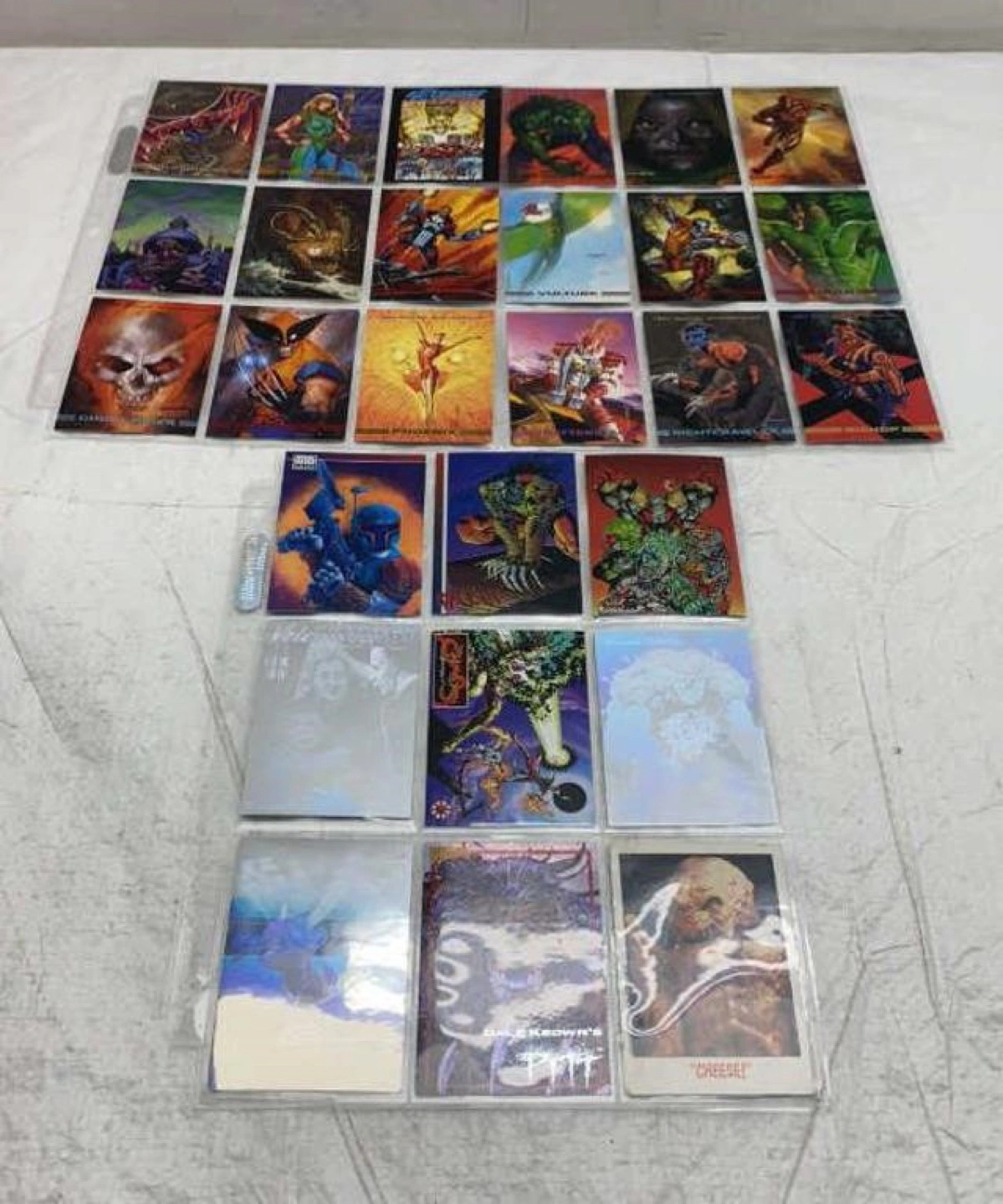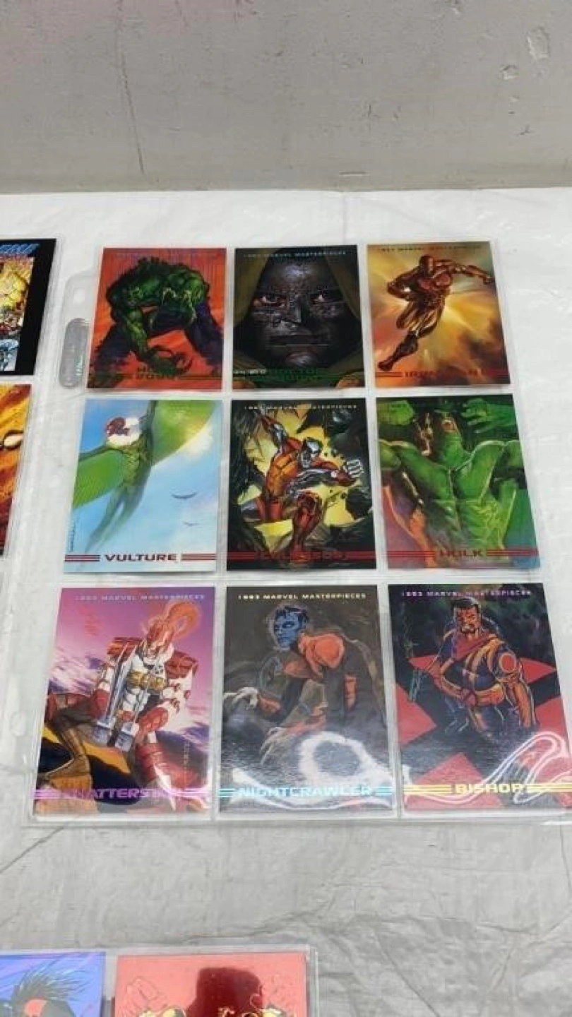 Large collection of 1993 Marvel Masterpieces trading cards. Includes various Marvel characters. Cards in protective sleeves within a binder. Great for collectors. Some random cards as well.