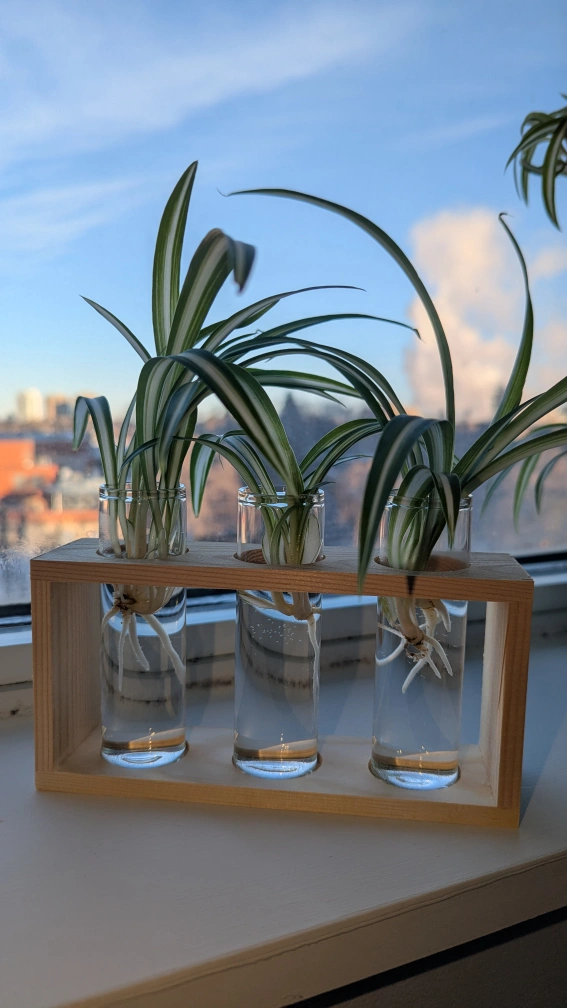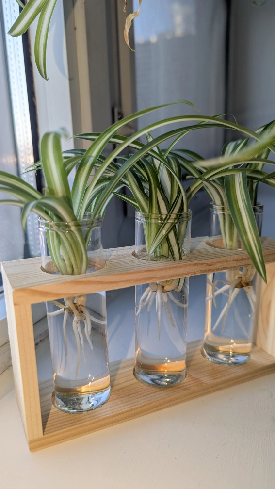 Spider plants in propagation station. Wooden stand holds several glass tubes.