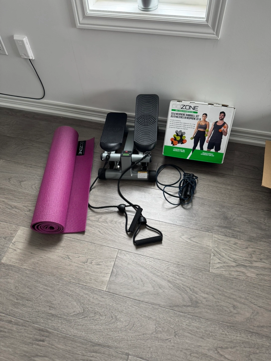 Fitness bundle. Includes purple yoga mat, new in box 32 lb neoprene dumbbell set, and mini stepper with resistance bands.