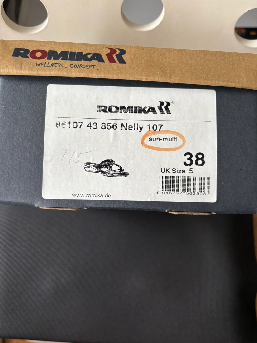 Women's Romika sandals. Size 38 UK 5. Multicoloured leather. Unique design. Comfortable. Like new condition. Original box.