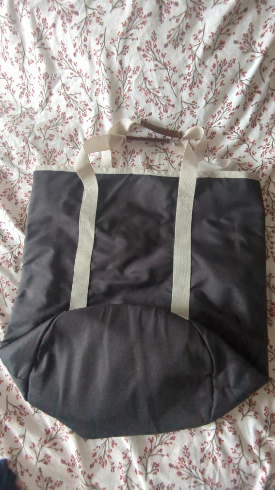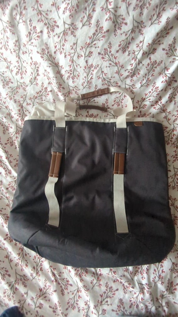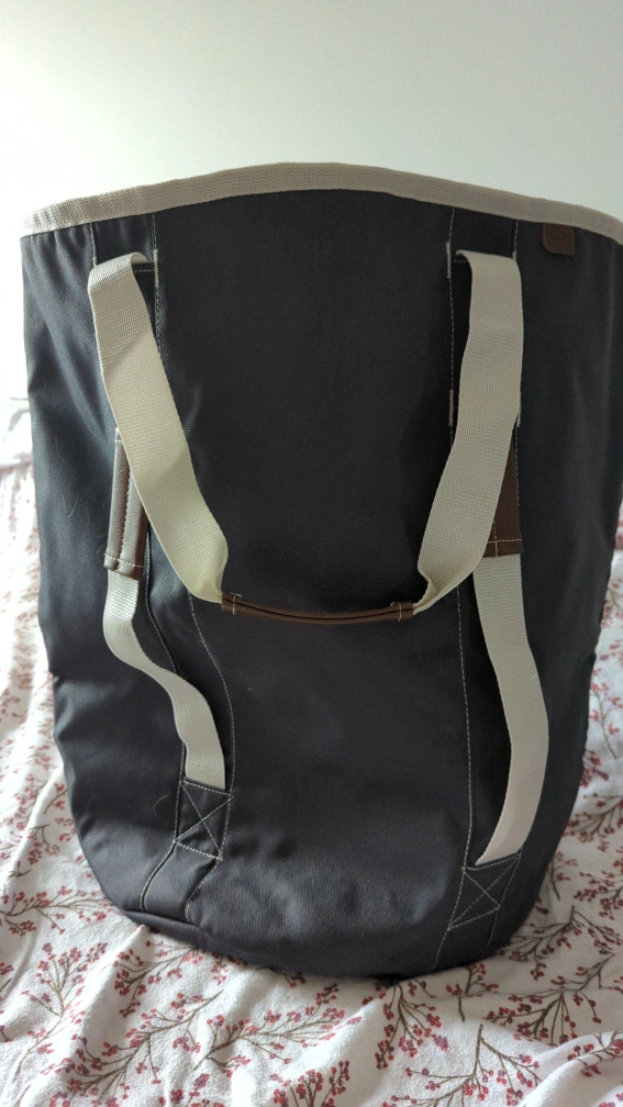 Large dark grey insulated tote bag. Features cream-coloured straps and brown leather accents. Interior drawstring bag included. Perfect for groceries or a picnic.