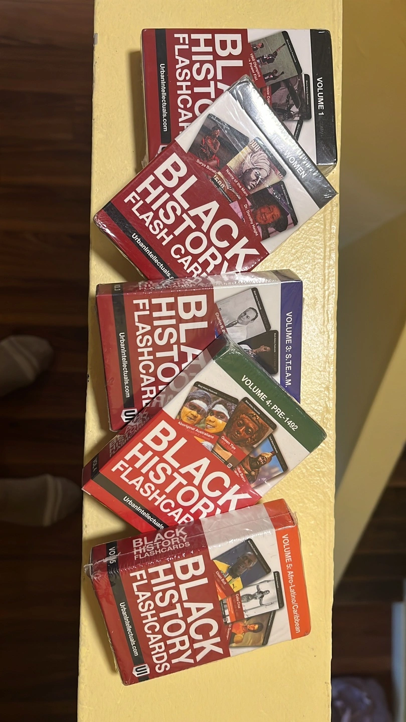 Set of five Black History flashcard volumes. Volumes include Women, S.T.E.A.M, Pre-1492, Afro-Latino/Caribbean. Educational and engaging.
