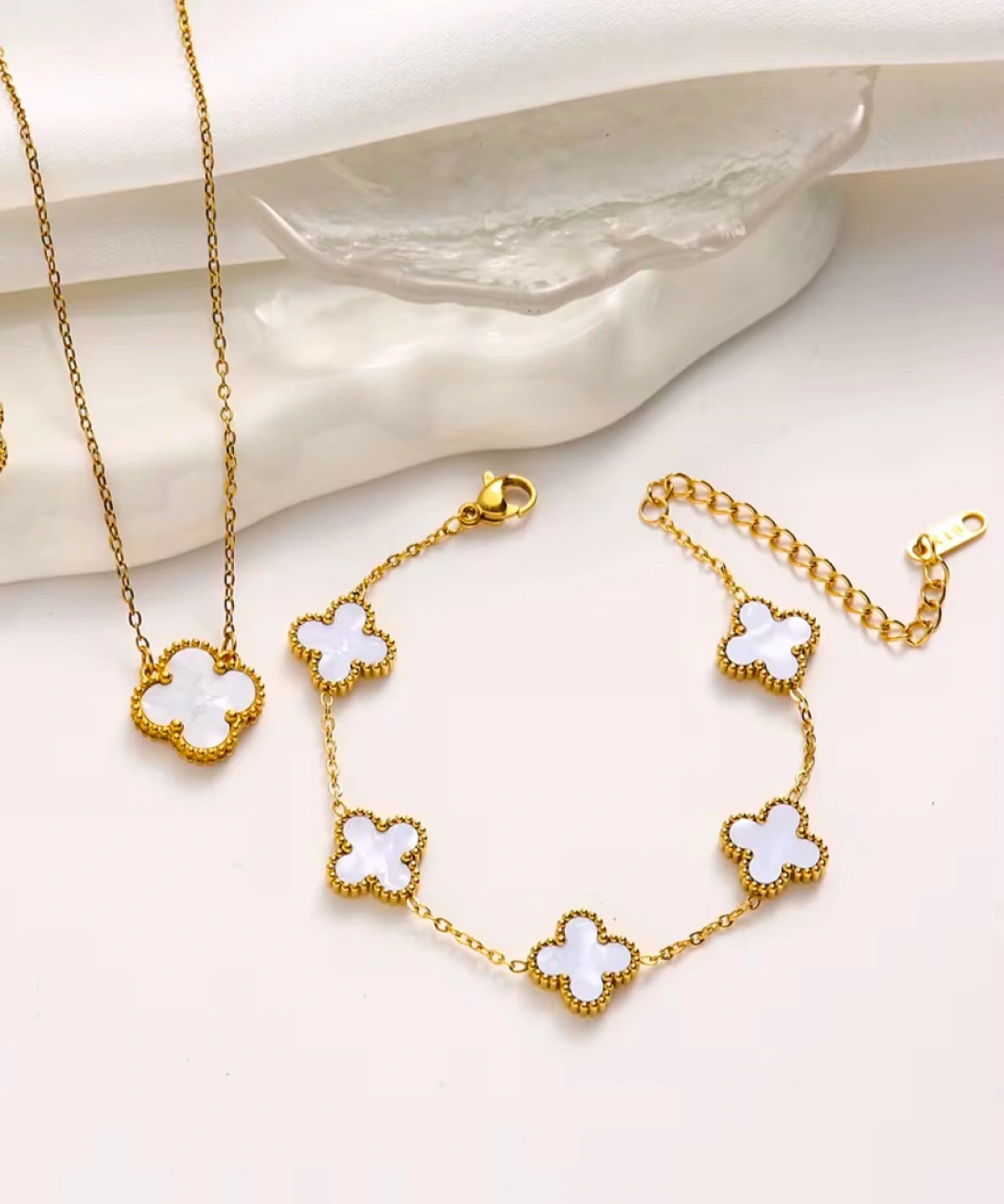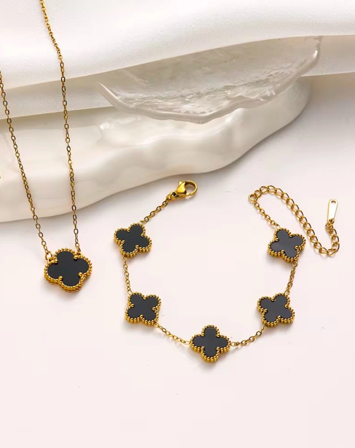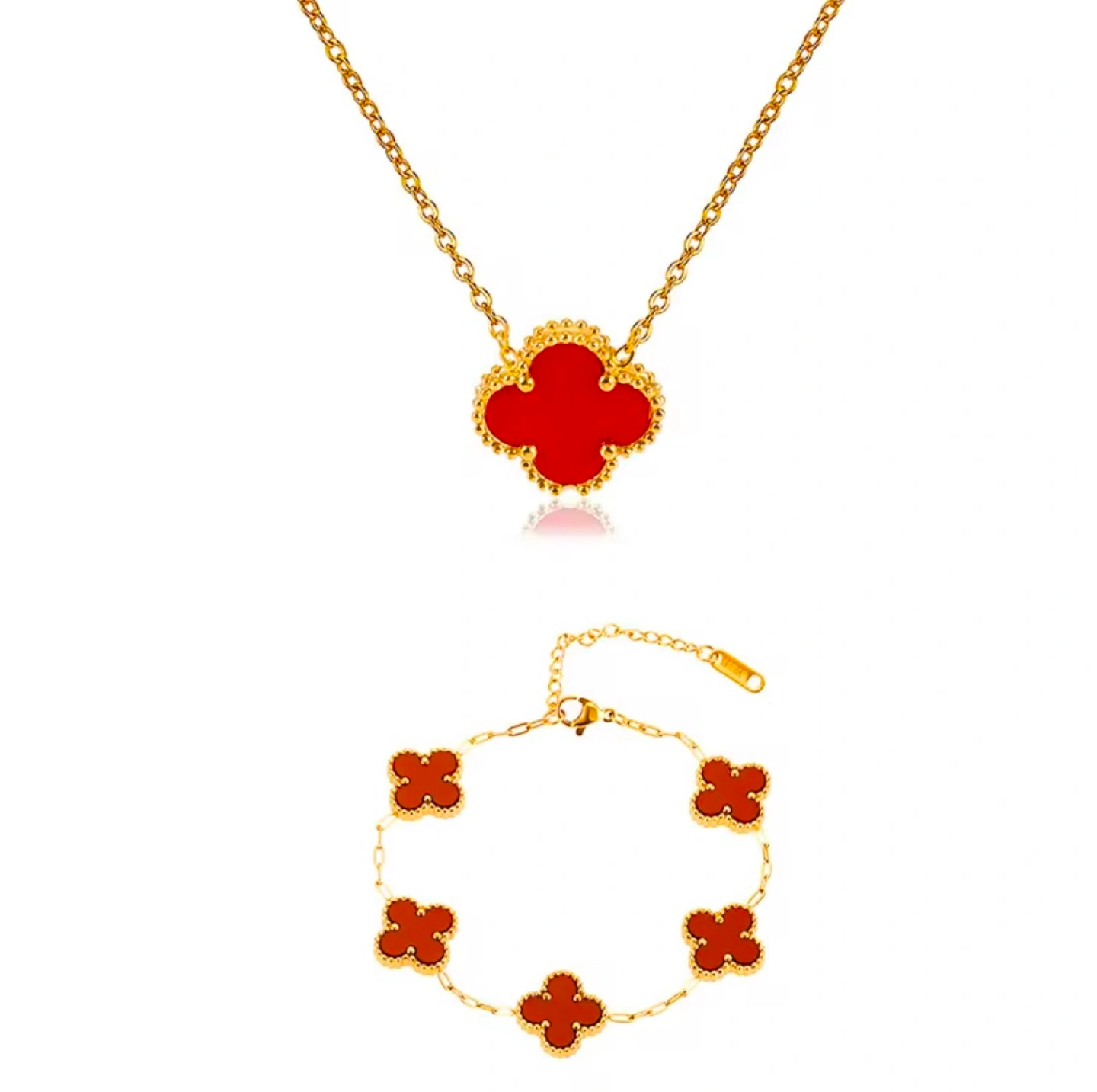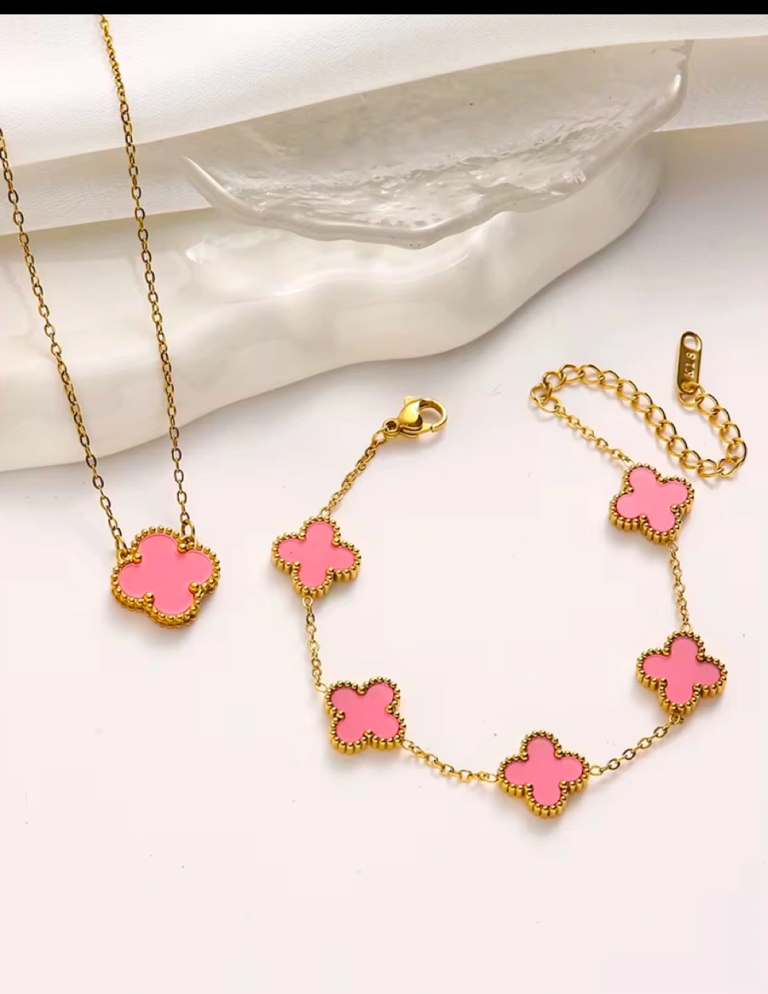 25Elegant gold-tone necklace and bracelet set. Features four-leaf clover pendants with coloured stones. Stylish and versatile jewellery perfect for everyday wear or special occasions. Set includes one necklace and one bracelet.