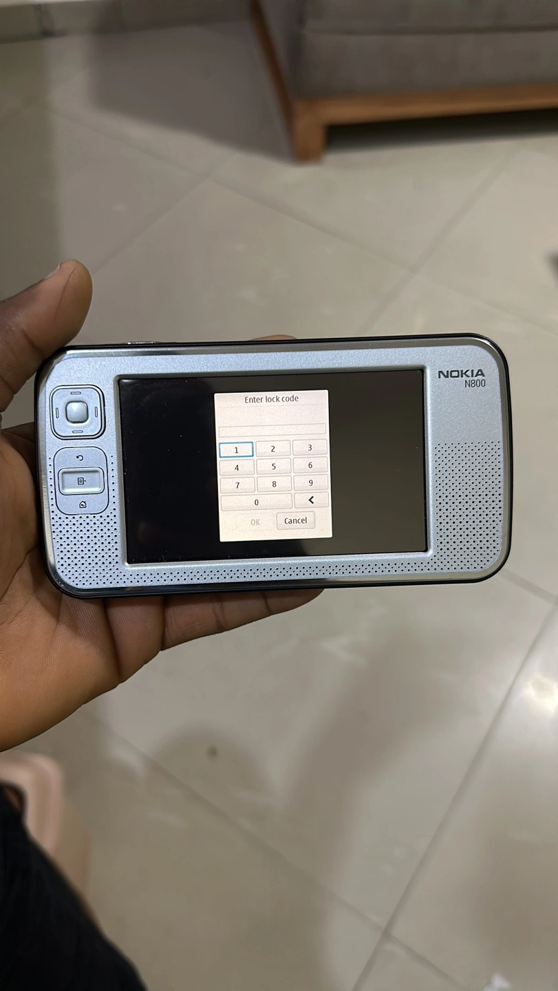Silver Nokia N800 internet tablet. Features a touchscreen and keypad. Requires a lock code.