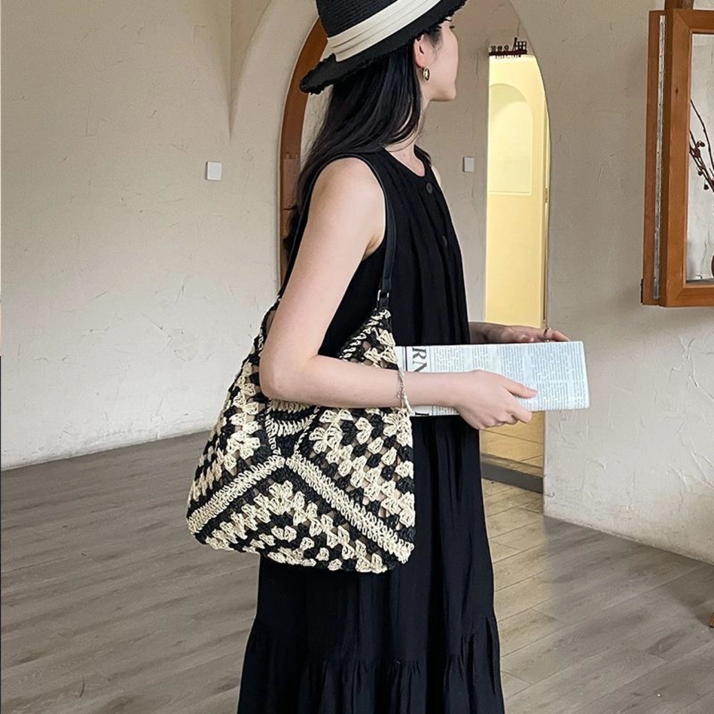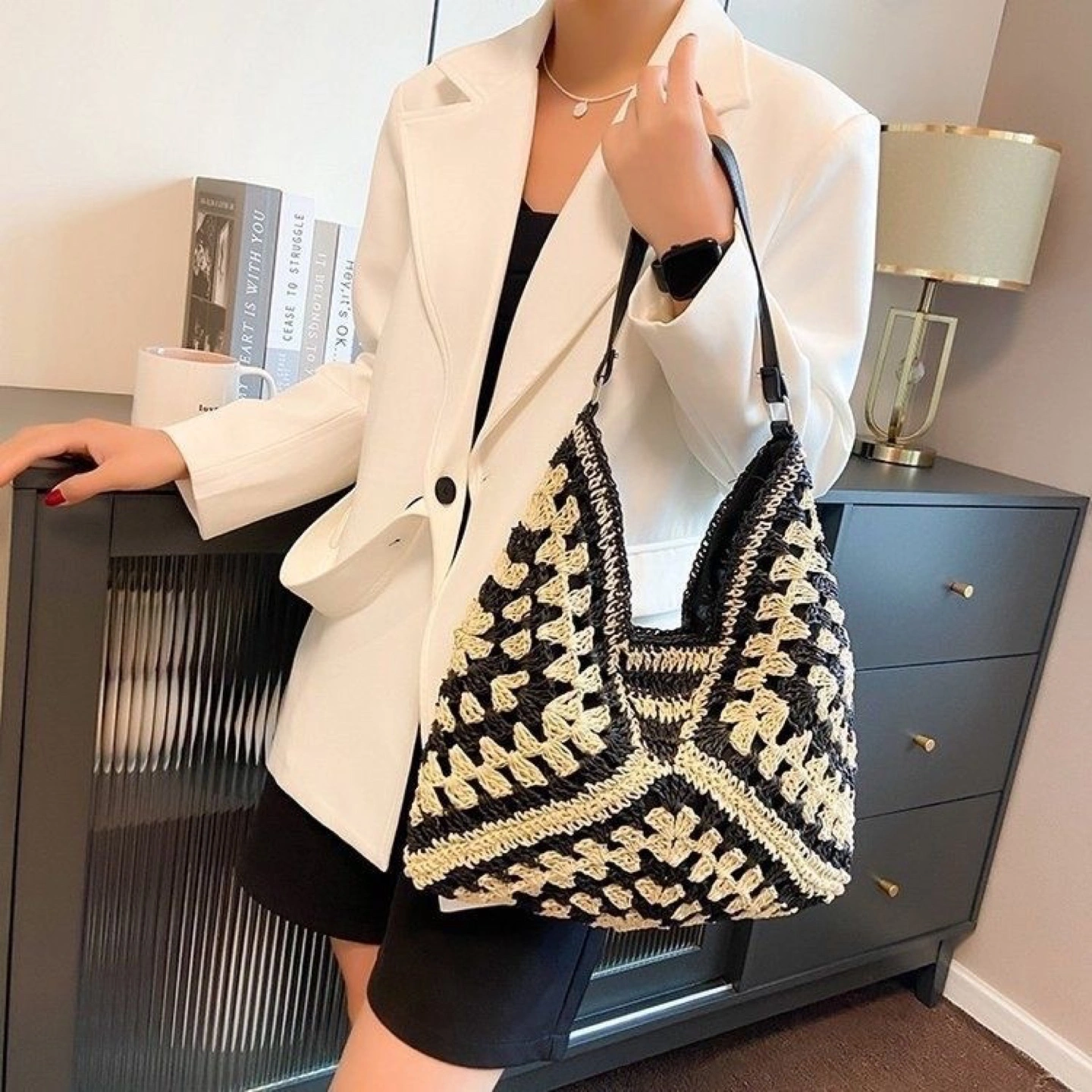 Unique crocheted design. Black and beige colour scheme. Lightweight and spacious. Perfect for summer. Leatherette handle.