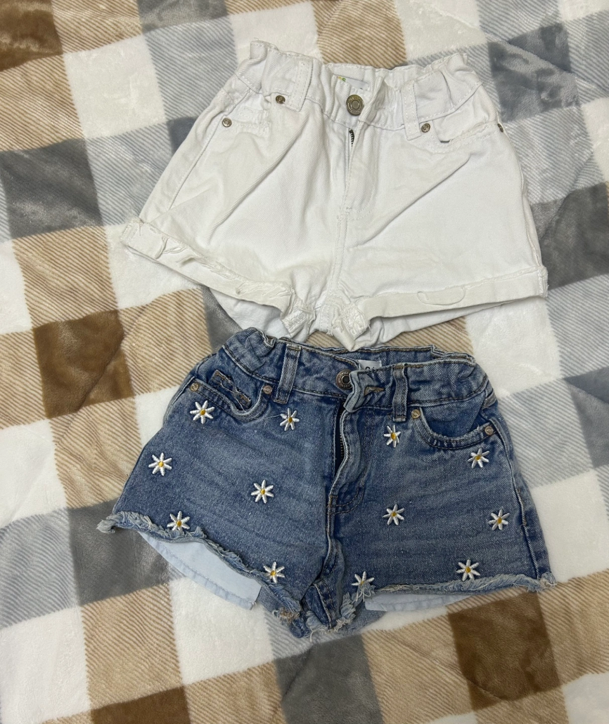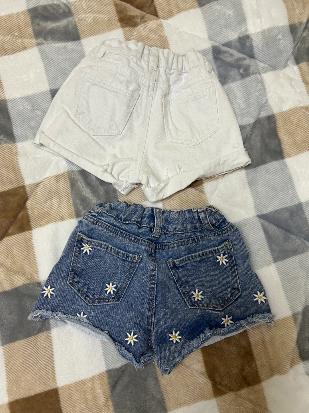 Two pairs of girls' denim shorts. One pair white, one pair light wash denim with embroidered daisies. Both pairs feature frayed hems.