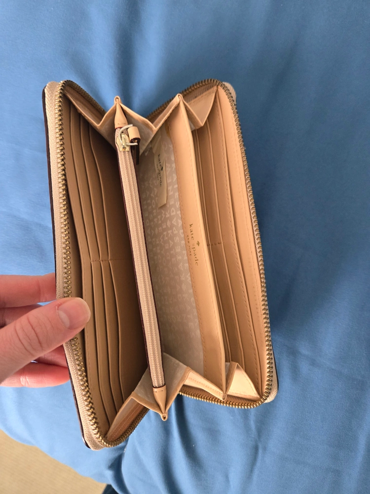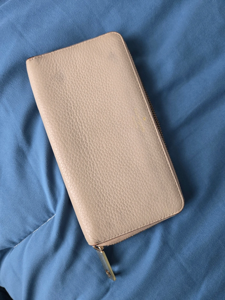 Pale beige leather zip-around wallet. Lots of card slots and compartments. Gold-toned hardware. Pre-owned.
