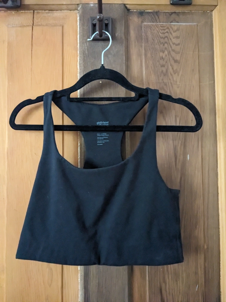 Black racerback sports bra. Supportive and comfortable. Great for low-impact workouts or everyday wear.
