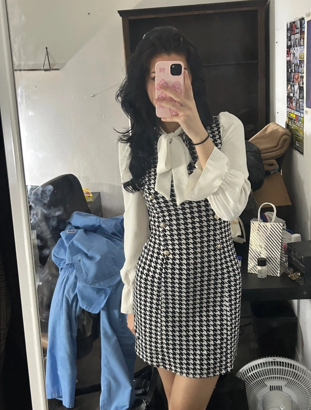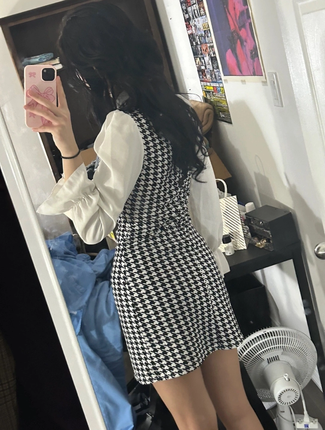 Mini dress. Houndstooth pattern. Features a white collared blouse overlay. Double breasted buttons. Great for a vintage or retro look.