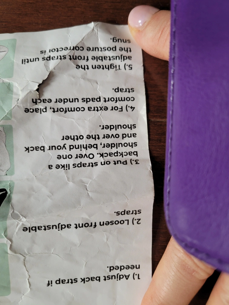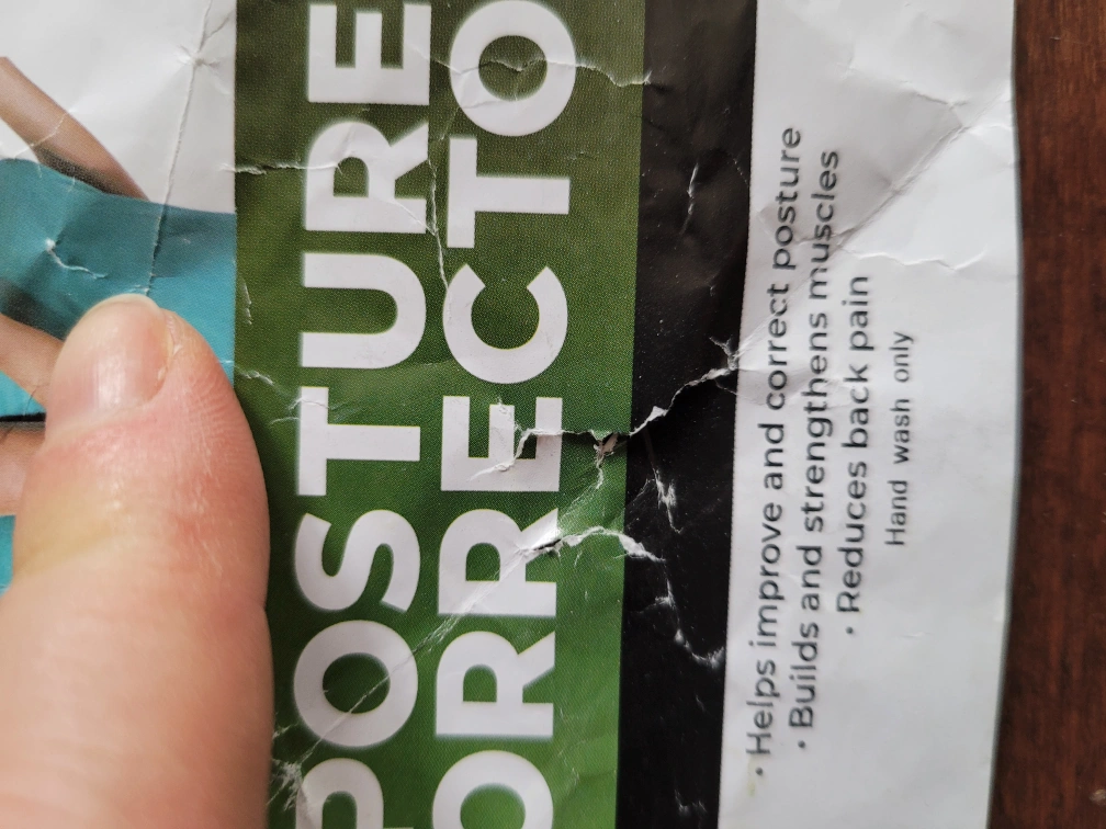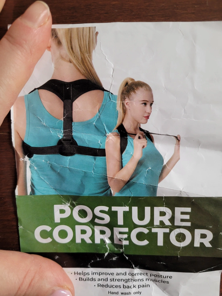 Black posture corrector. Adjustable straps. Features padded shoulder straps and back support. Helps improve posture, strengthens muscles, and reduces back pain. Hand wash only.