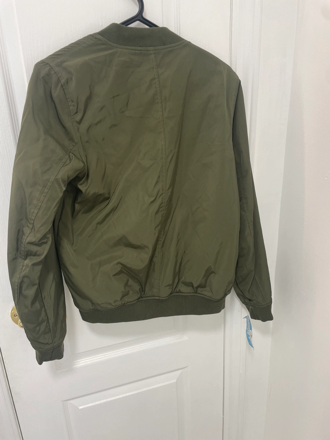 Men's olive green bomber jacket. Sherpa lining. Zip closure. Two pockets. Size medium. Brand new with tags.