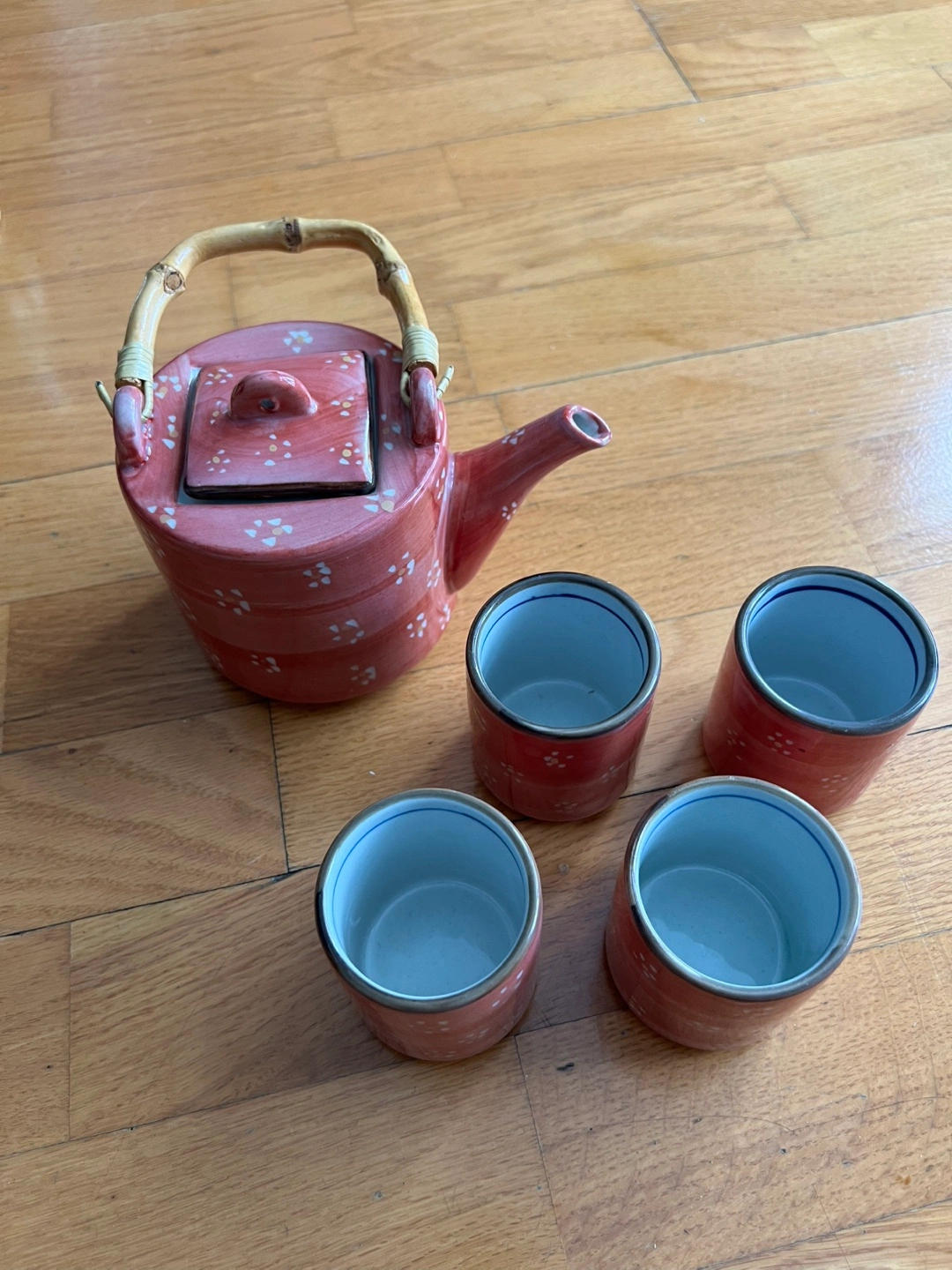 Charming vintage teapot set. Features a pink ceramic teapot with bamboo handle and four coordinating cups. Small white floral pattern adorns the teapot and cups. Perfect for a quaint afternoon tea.