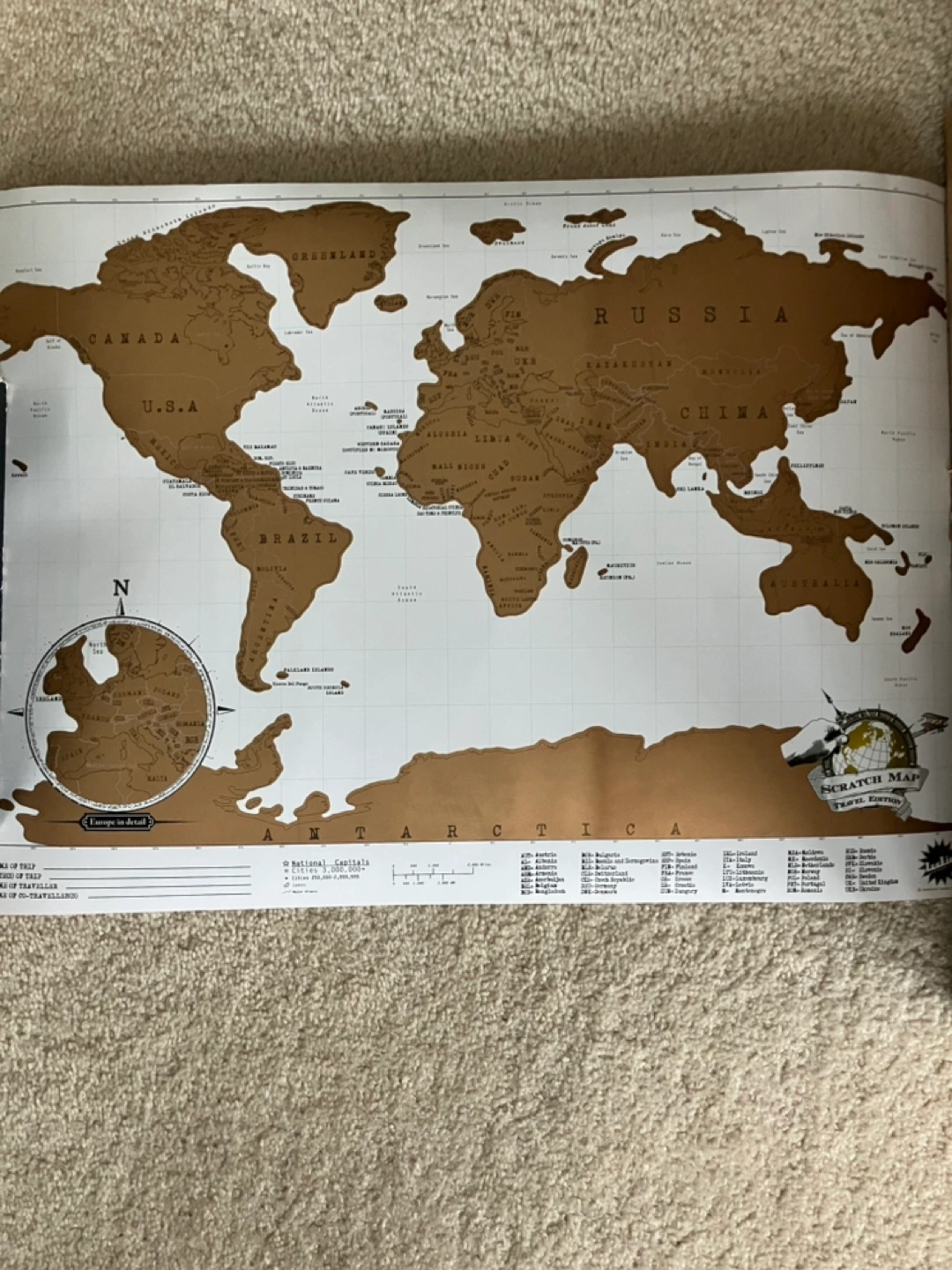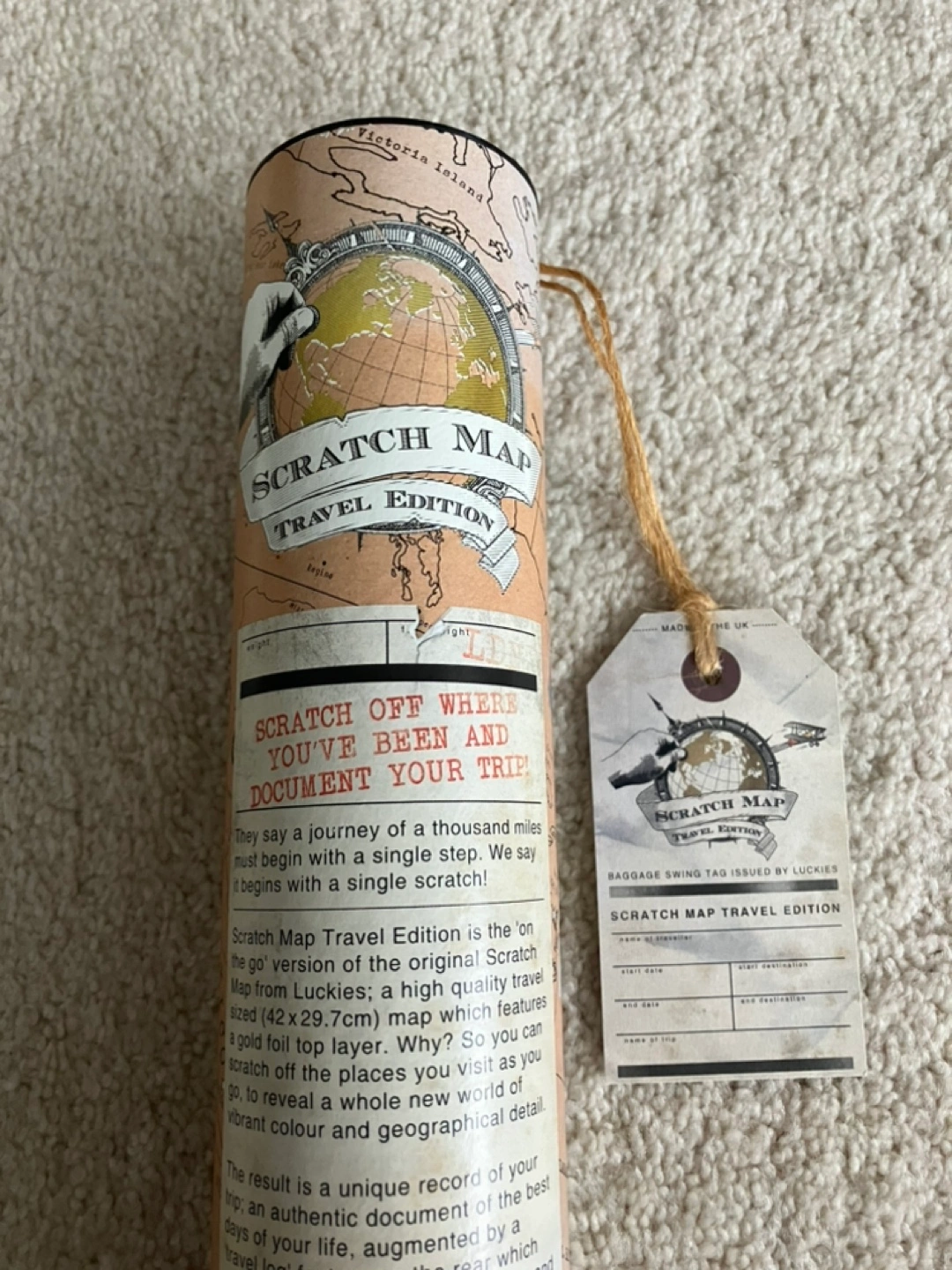 Vintage-style scratch-off world map. Reveals vibrant colours when you scratch off the countries you’ve visited. Would make a great pre-trip gift! Decorative storage tube has slight fading.