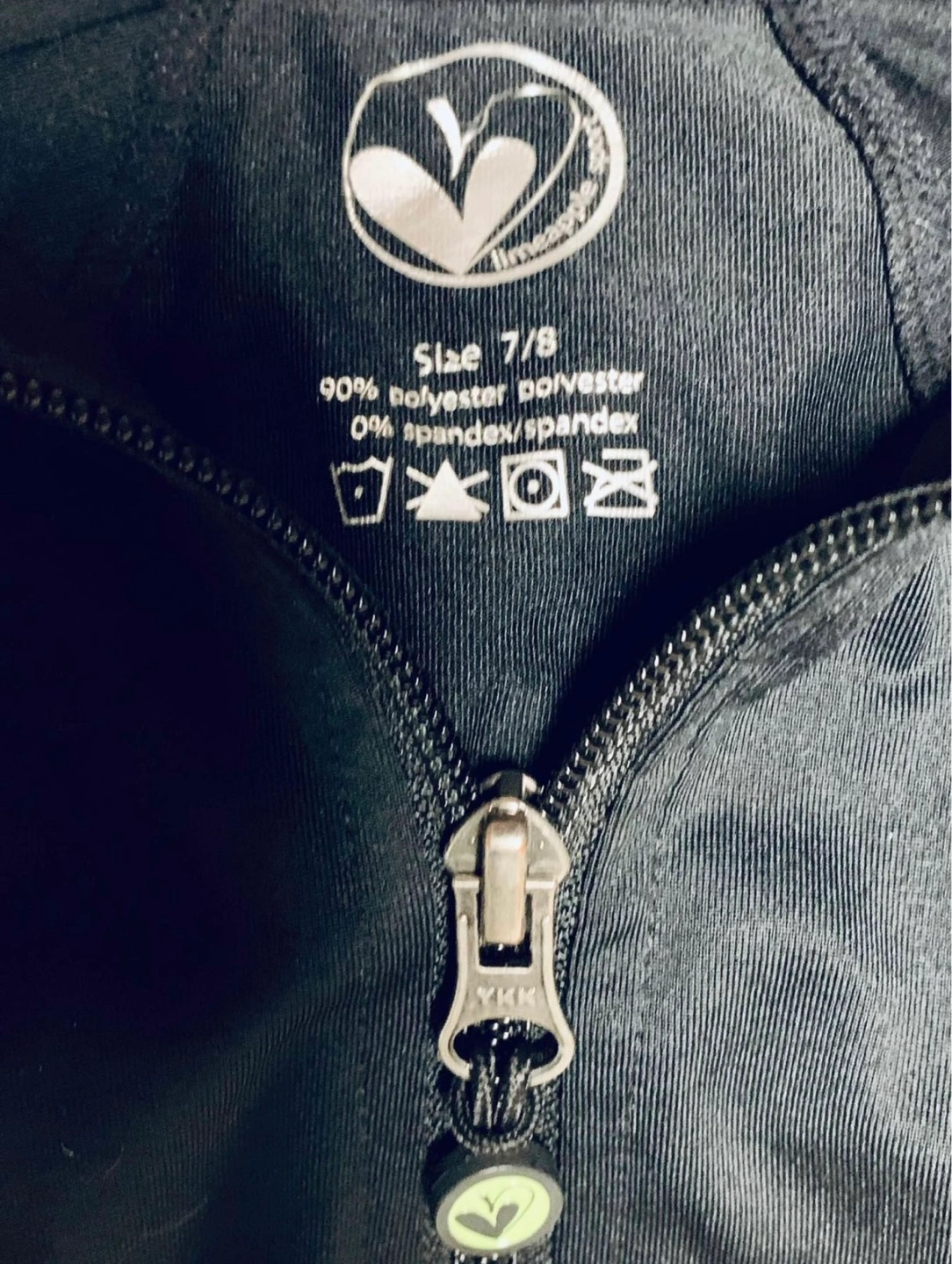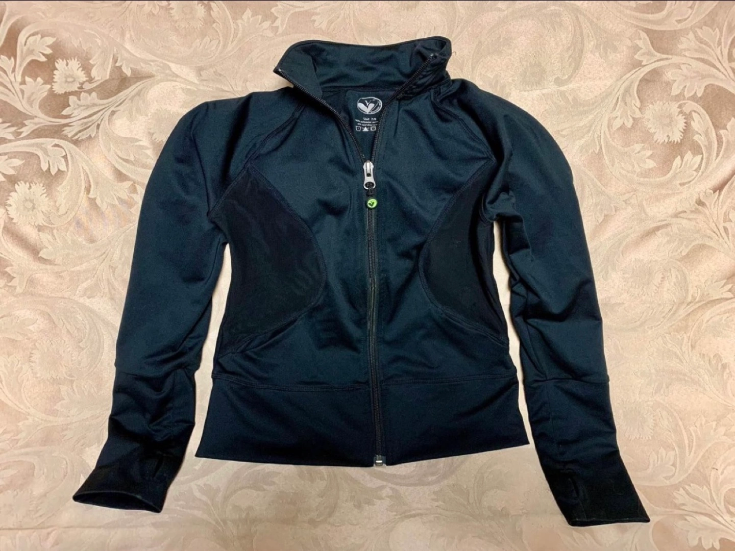 Black zip-up athletic jacket. Long sleeves, mock neck. Size 7/8. 90% polyester, 10% spandex. YKK zipper.