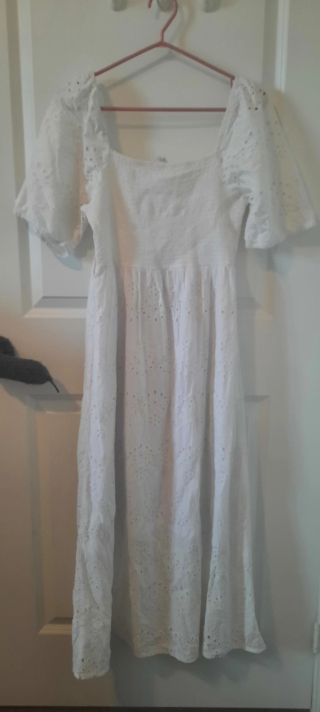 104Beautiful white eyelet midi dress. Features short sleeves and a square neckline. Lined. Perfect for summer. Pick up only, payment by exact cash only. min purchase $10. From a non smoking home.
