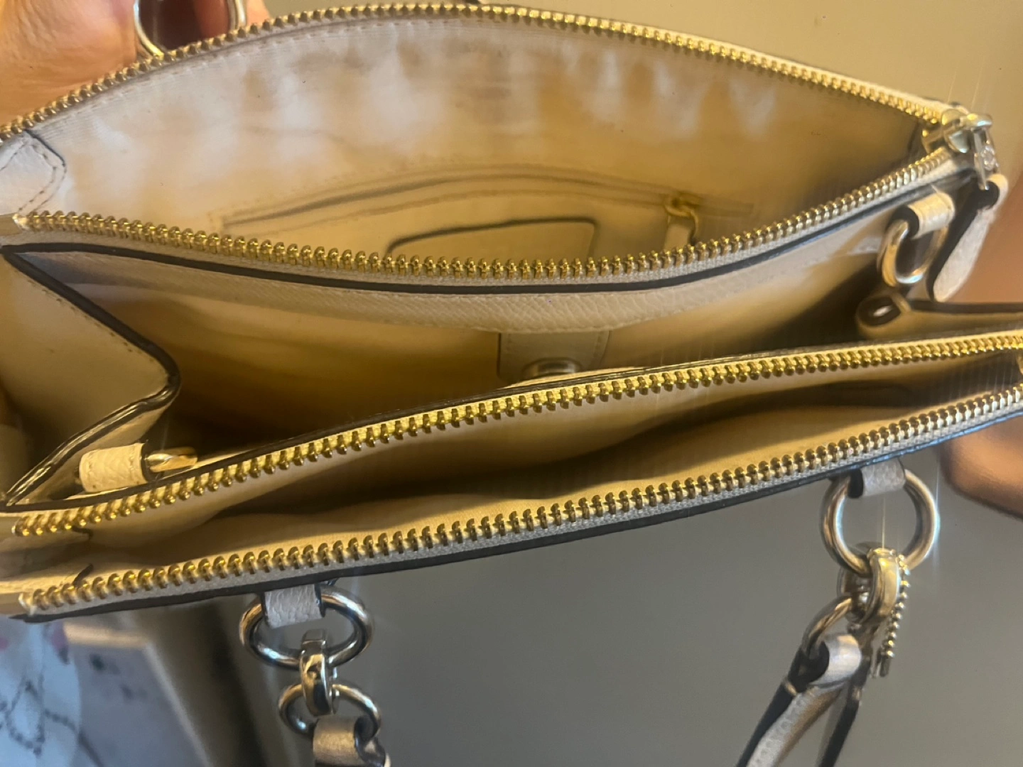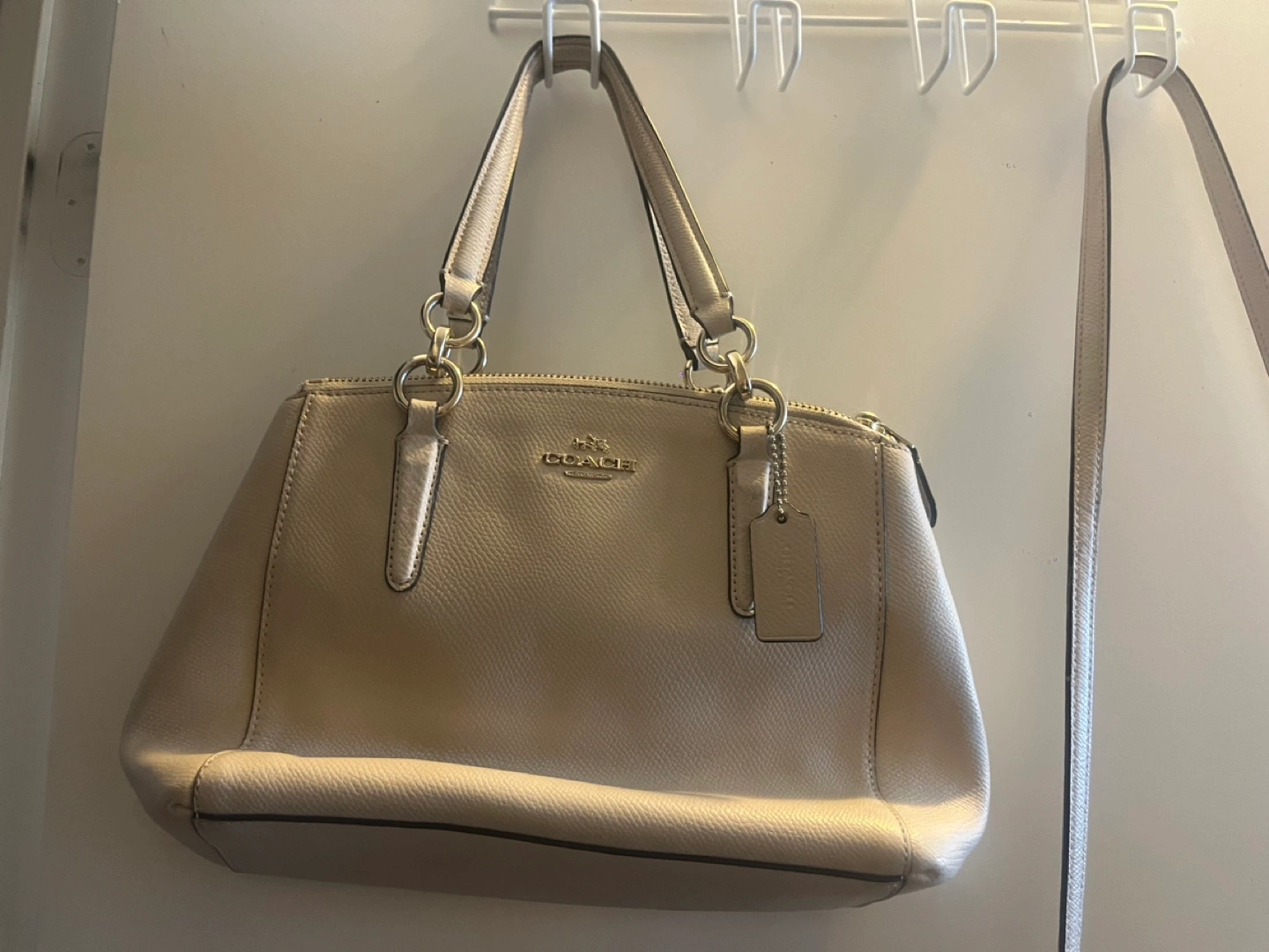 Cream coloured leather handbag. Features a top zip closure, dual top handles, and a detachable crossbody strap. Interior includes multiple zippered compartments. Pre-owned, good condition.