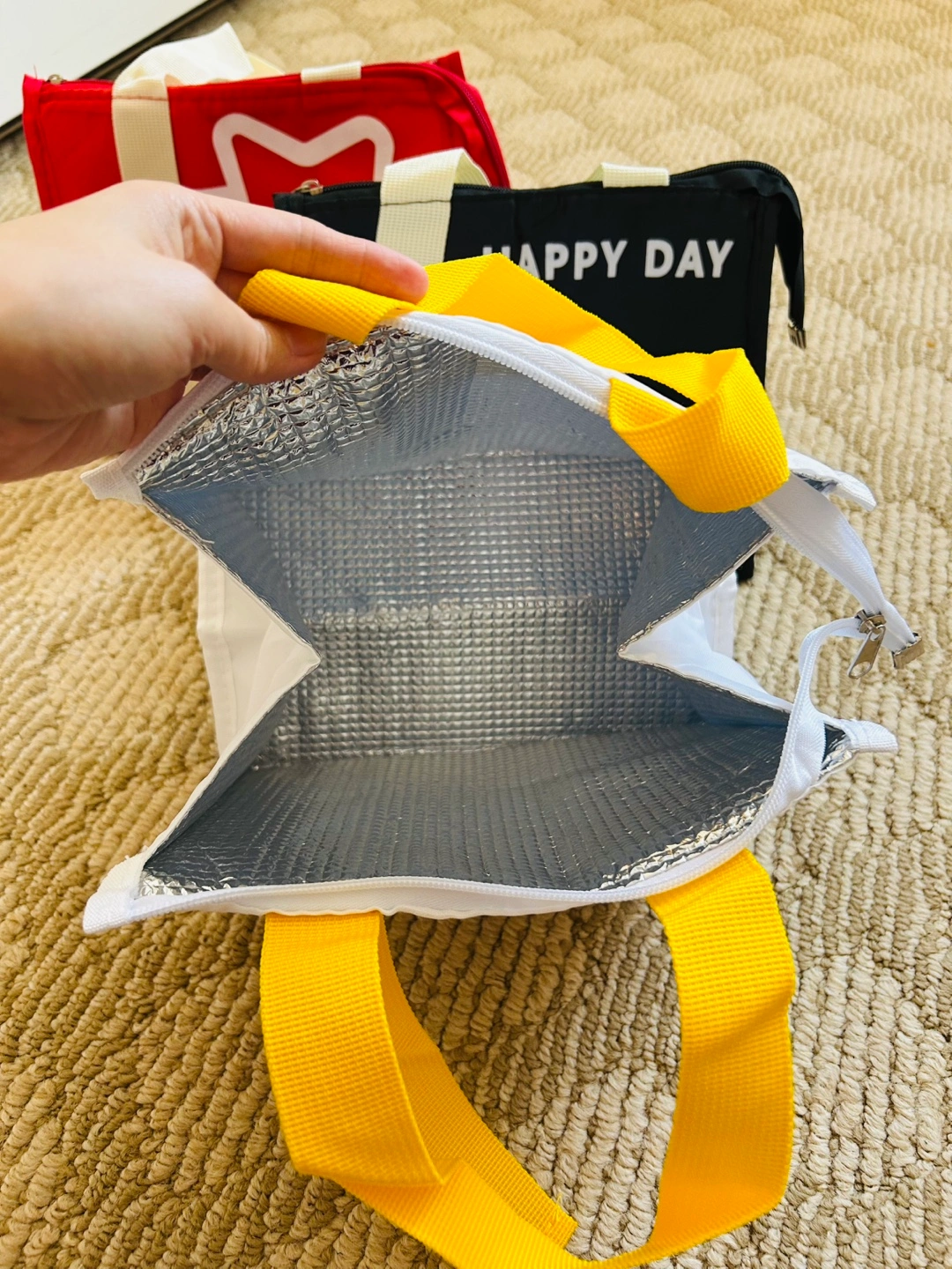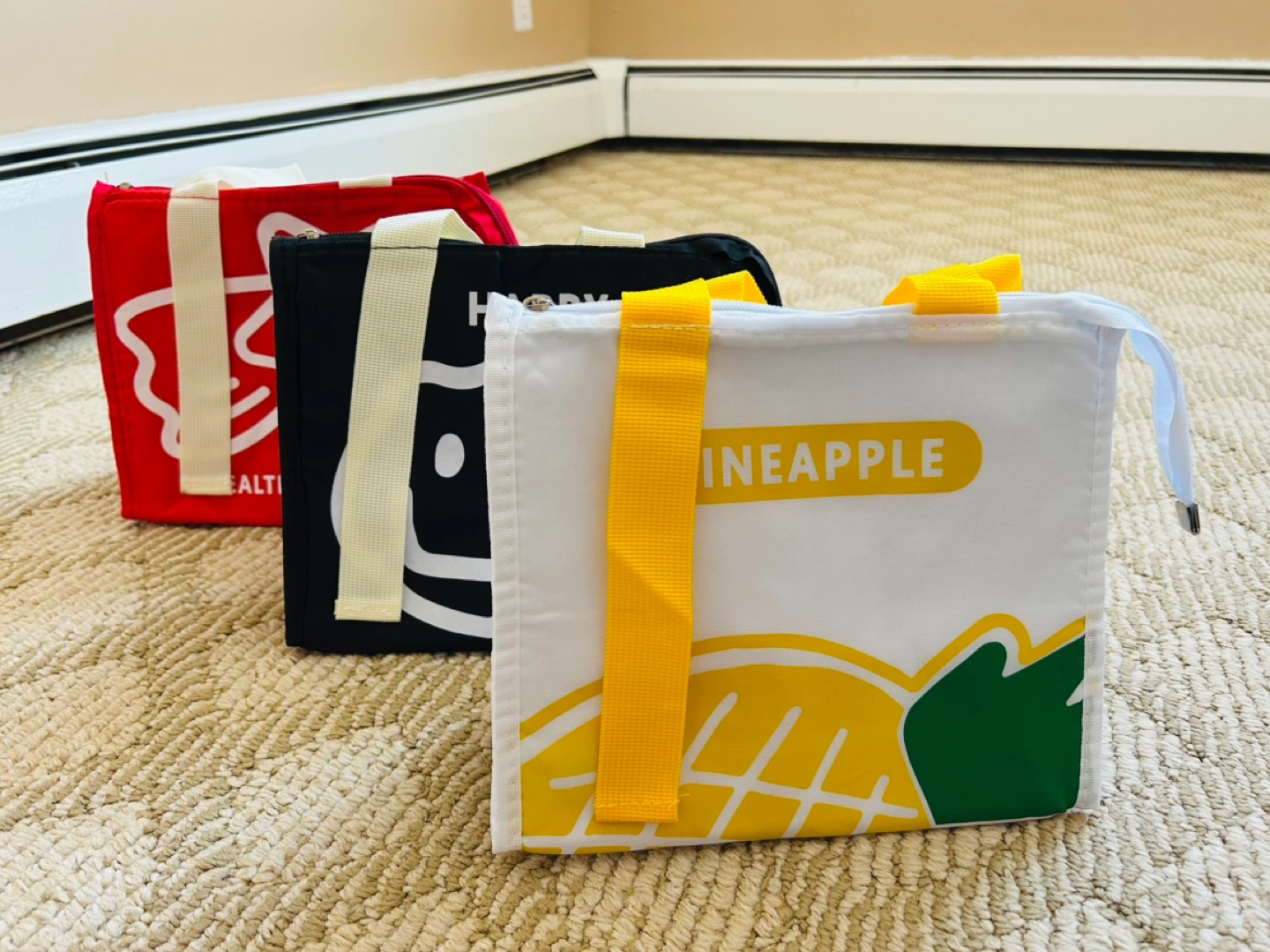Four reusable insulated lunch bags. Various colours and designs. Great for work or school. Features zipper closure and carrying handles.