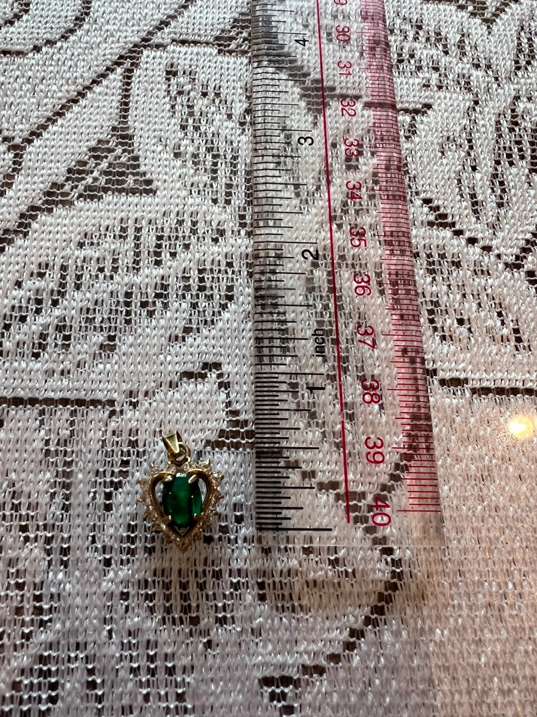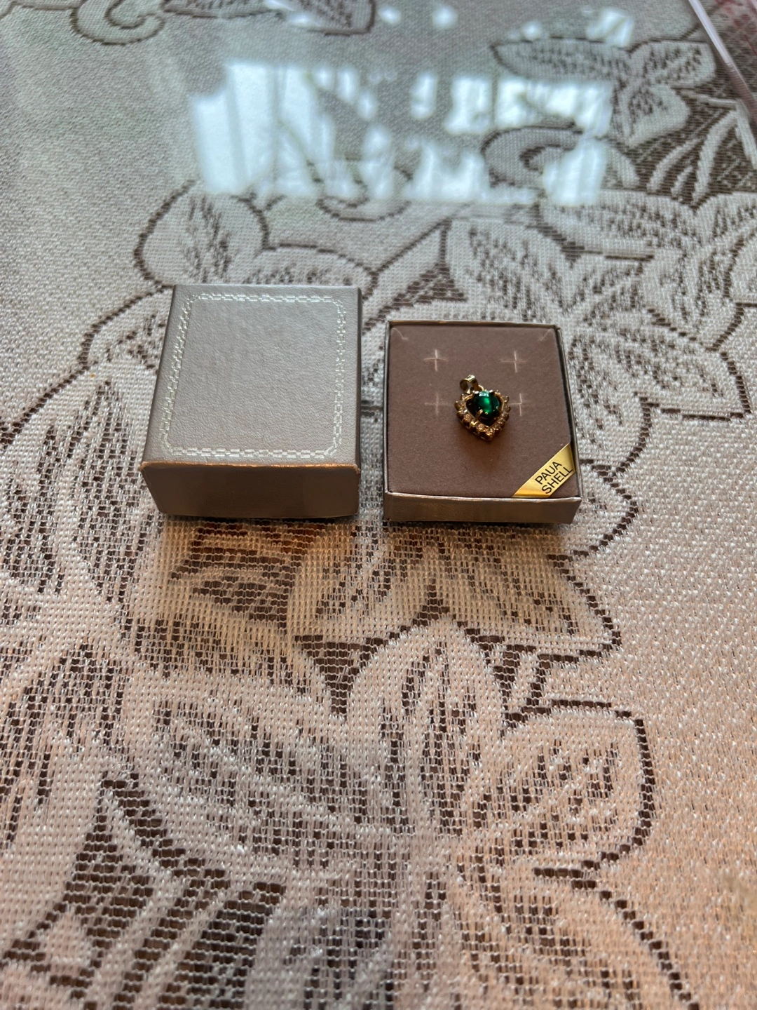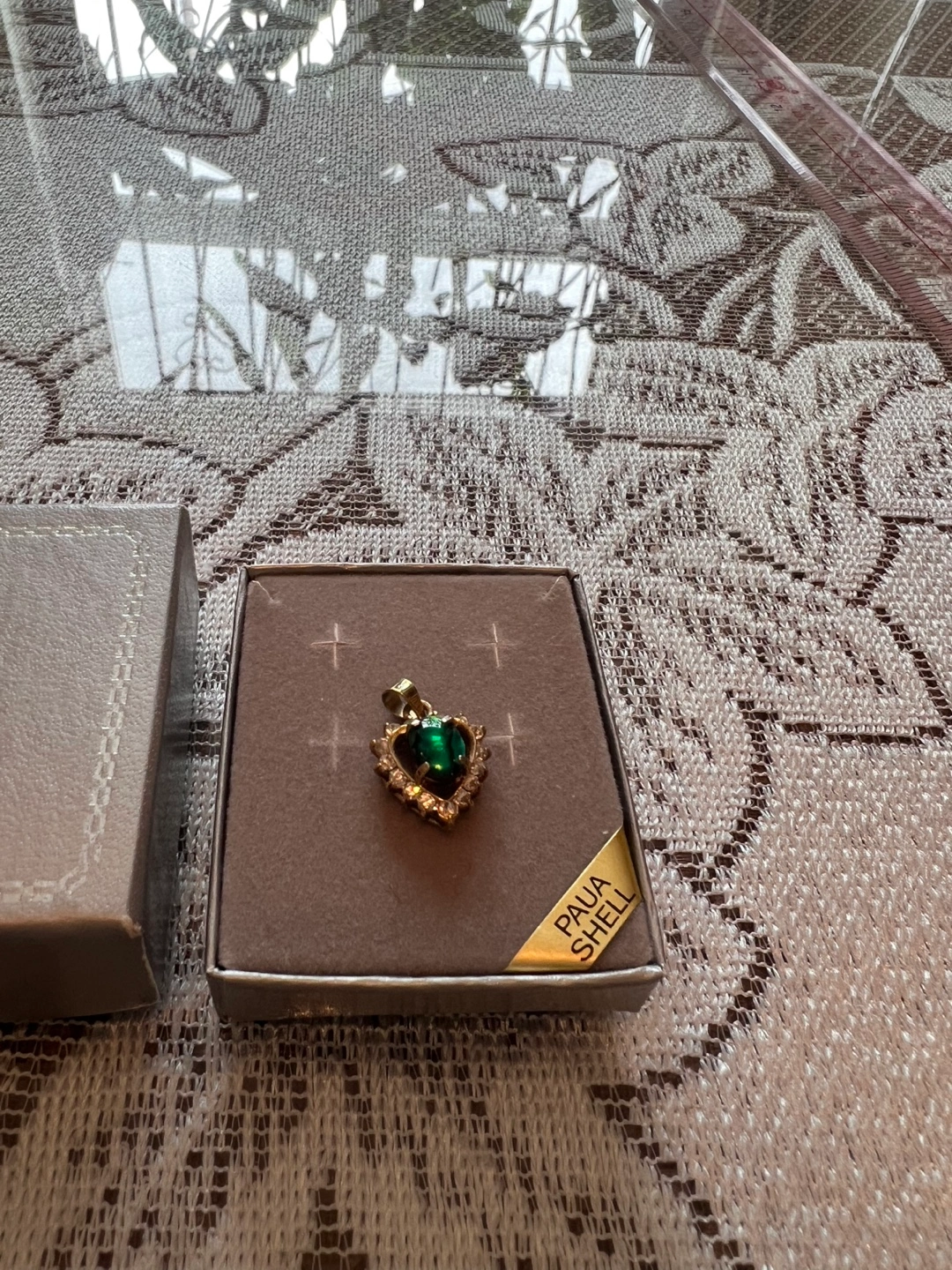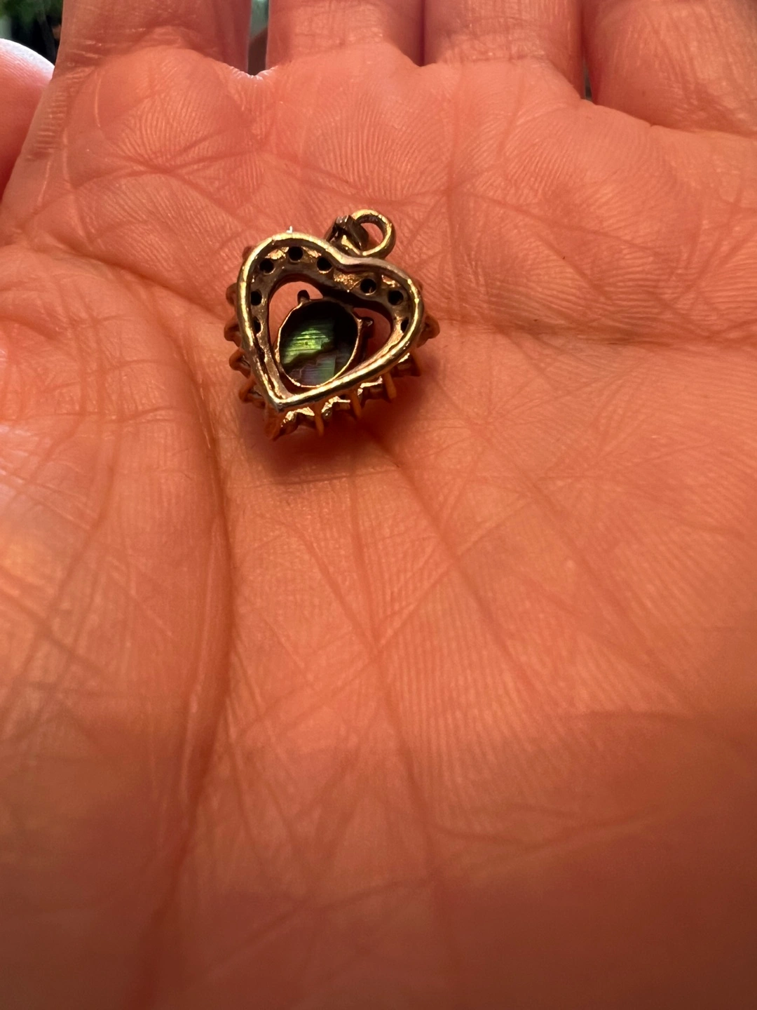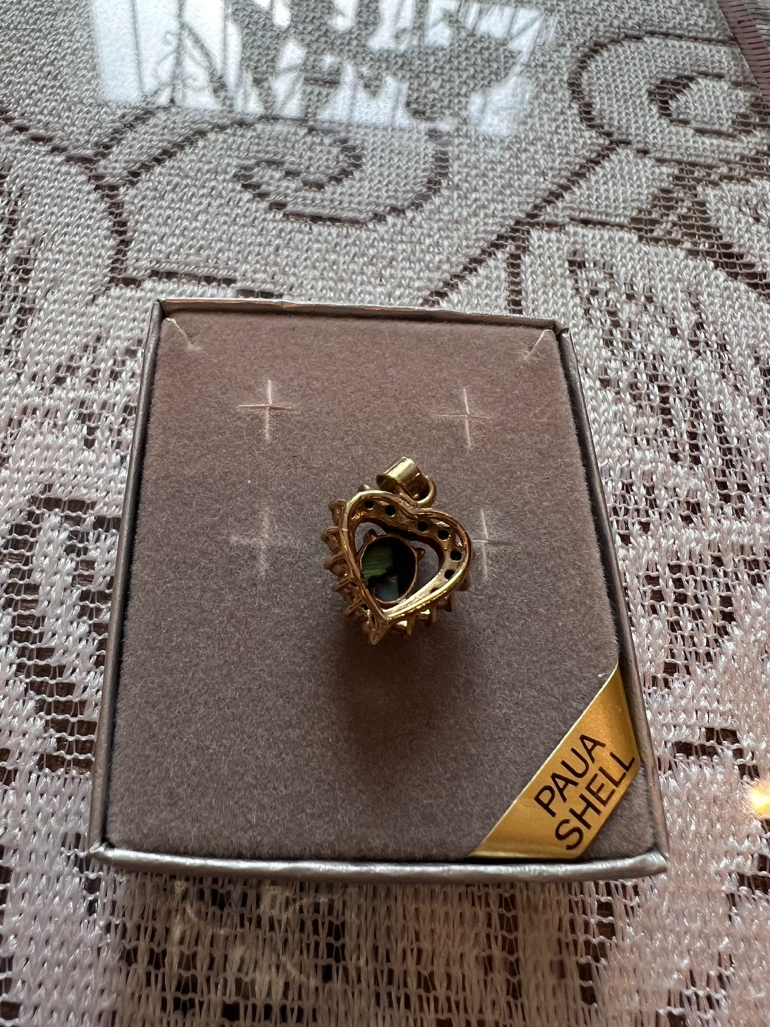 Gorgeous heart-shaped pendant. Features an emerald-green Paua shell centre stone surrounded by crystals and a gold-tone metal. Comes in original box.