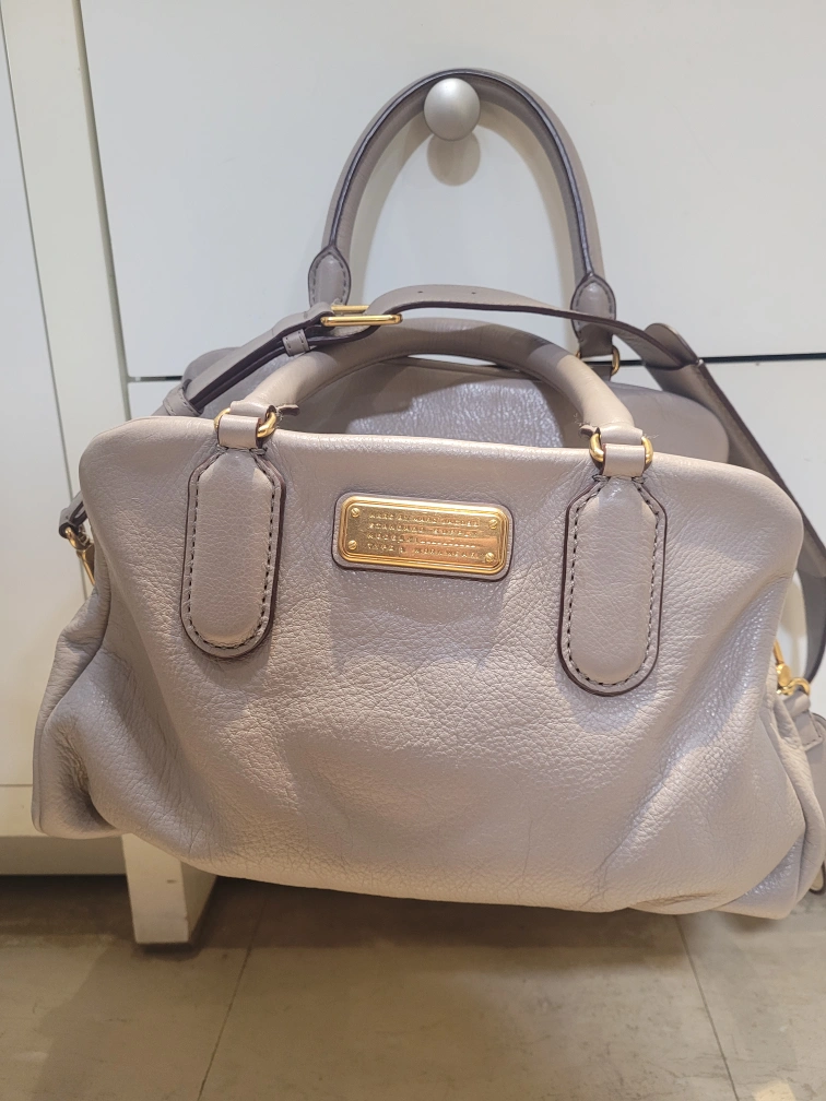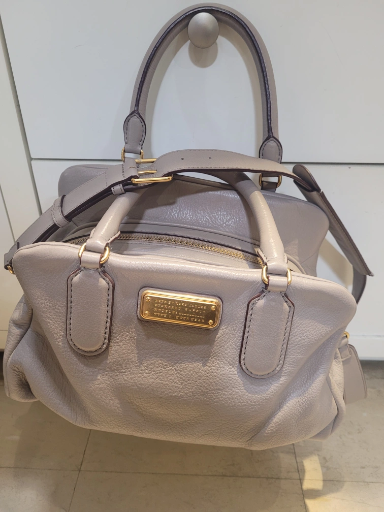 Grey leather satchel bag. Double top handles and a detachable shoulder strap. Gold-toned hardware. Zip closure. Roomy interior.