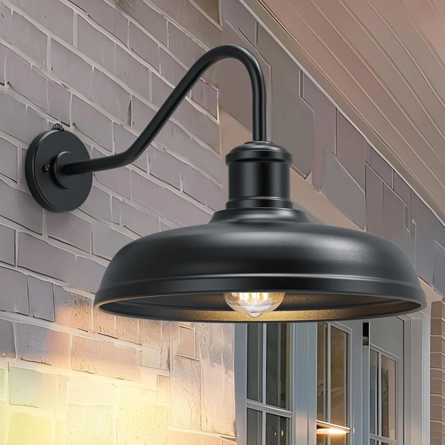 【Extra Large Size Farmhouse Gooseneck Barn Light】 This farmhouse outdoor lighting measures 24.4"L x 16"W x 14.3"H. The dome of the barn light is 16 inches and the mounting back plate diameter is 4.3''. This farmhouse outdoor lighting is ideal for your front door, gardens, garage, front porch, yards, and commercial uses such as overnight security, area lighting, etc.