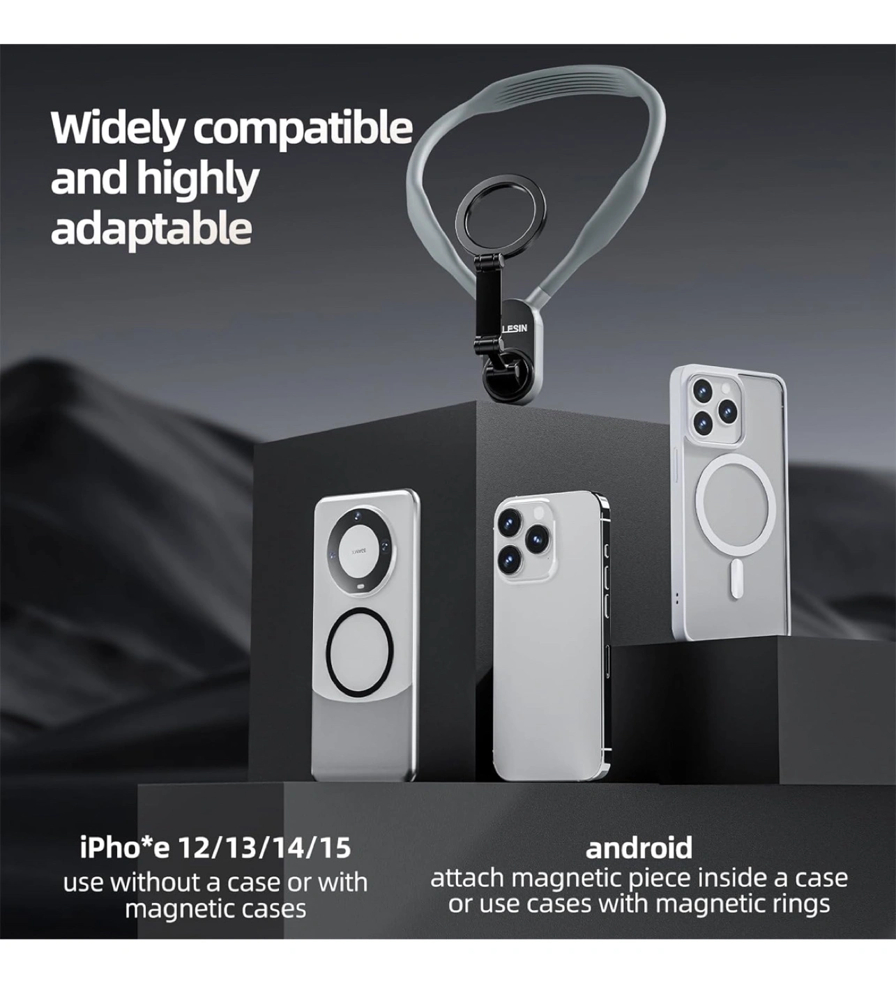 New Sleek and minimalist design. Compatible with iPhone 12/13/14/15 and Android phones. Use without a case or with magnetic cases. Adjustable neck strap. Magnetic phone mount. Includes magnetic ring for Android phones.