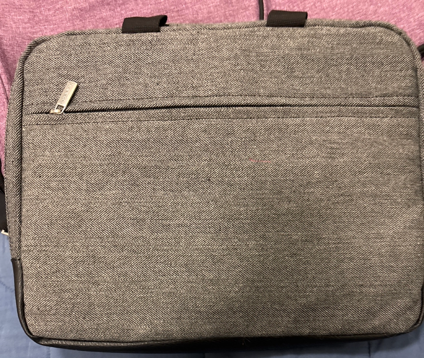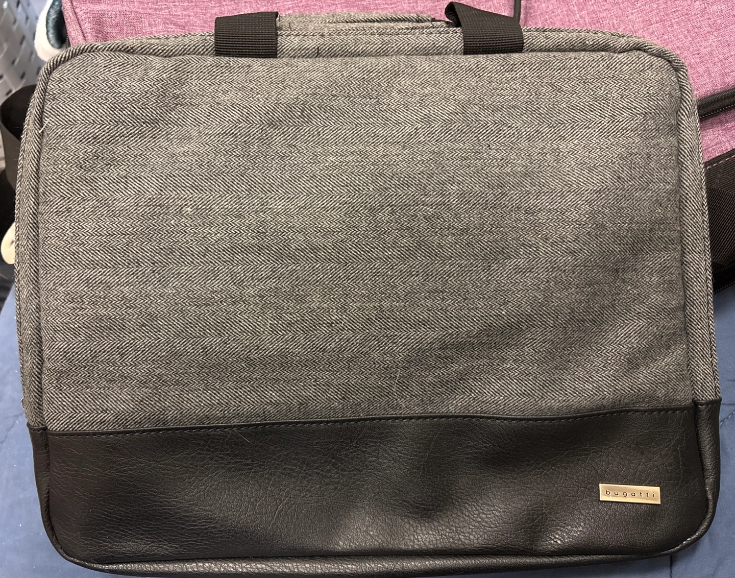 Grey herringbone fabric. Black faux leather bottom. Two top handles. Small zippered pocket on the front. Great for work or travel. Only used once. Open to negotiations, pick up only