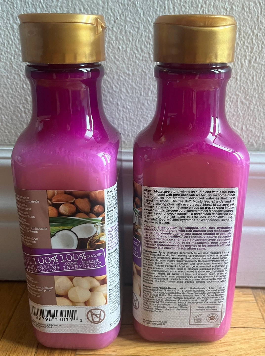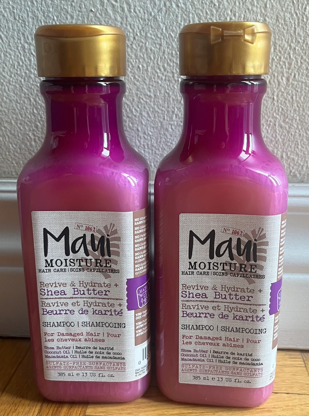 Two bottles of Maui Moisture Revive & Hydrate + Shea Butter shampoo. For damaged hair. Contains shea butter, macadamia oil, and coconut oil. Sulfate-free. 385 ml each.Cash only