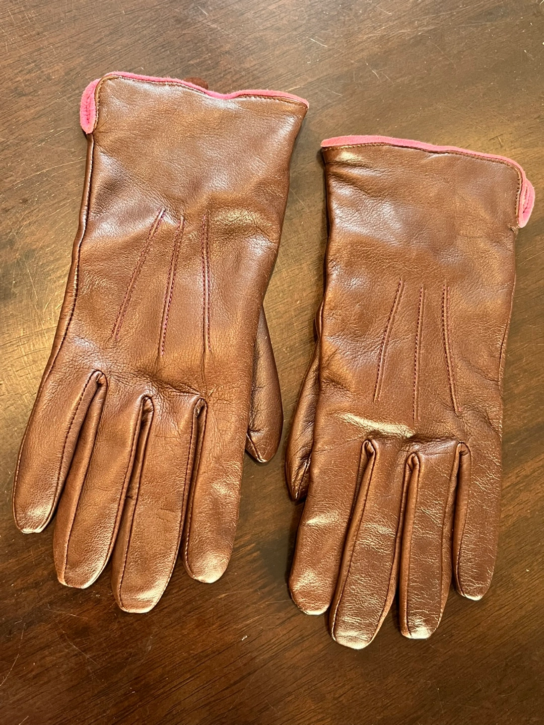 Women's brown leather gloves. Pink trim and stitching. 100% leather exterior, 100% lamb wool lining. Size Medium. Near perfect condition.