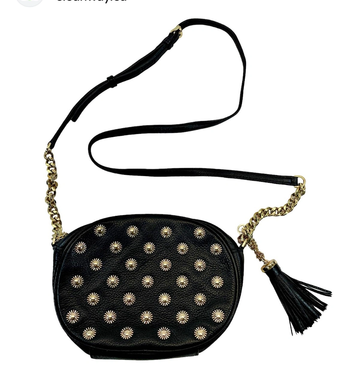 Black leather crossbody bag. Oval shape. Gold-tone studs. Gold-tone chain and leather strap. Interior pocket. Excellent condition