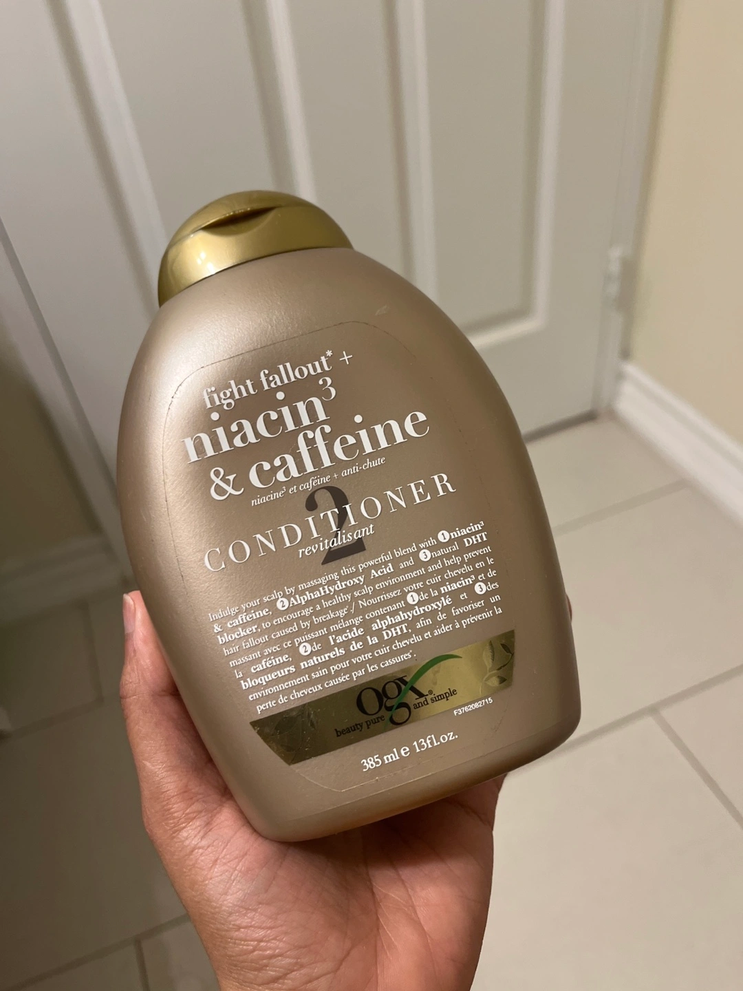 385ml conditioner. Revitalisant. Helps prevent hair fallout caused by breakage. Contains niacin, caffeine, alpha hydroxy acid, and natural DHT blocker.