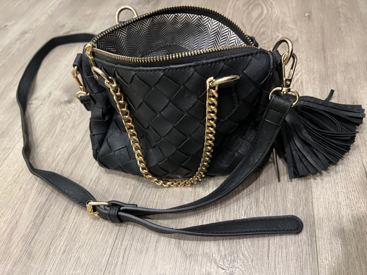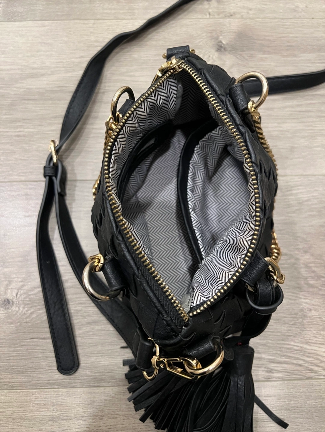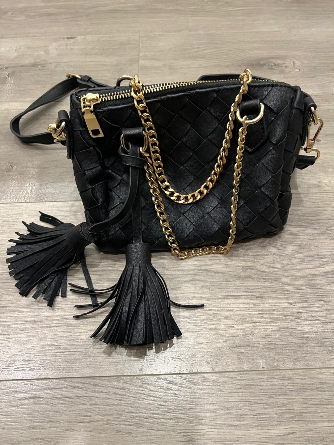 Small black crossbody bag. Features woven design, gold chain strap and black tassels. Zipper closure. Adjustable strap.