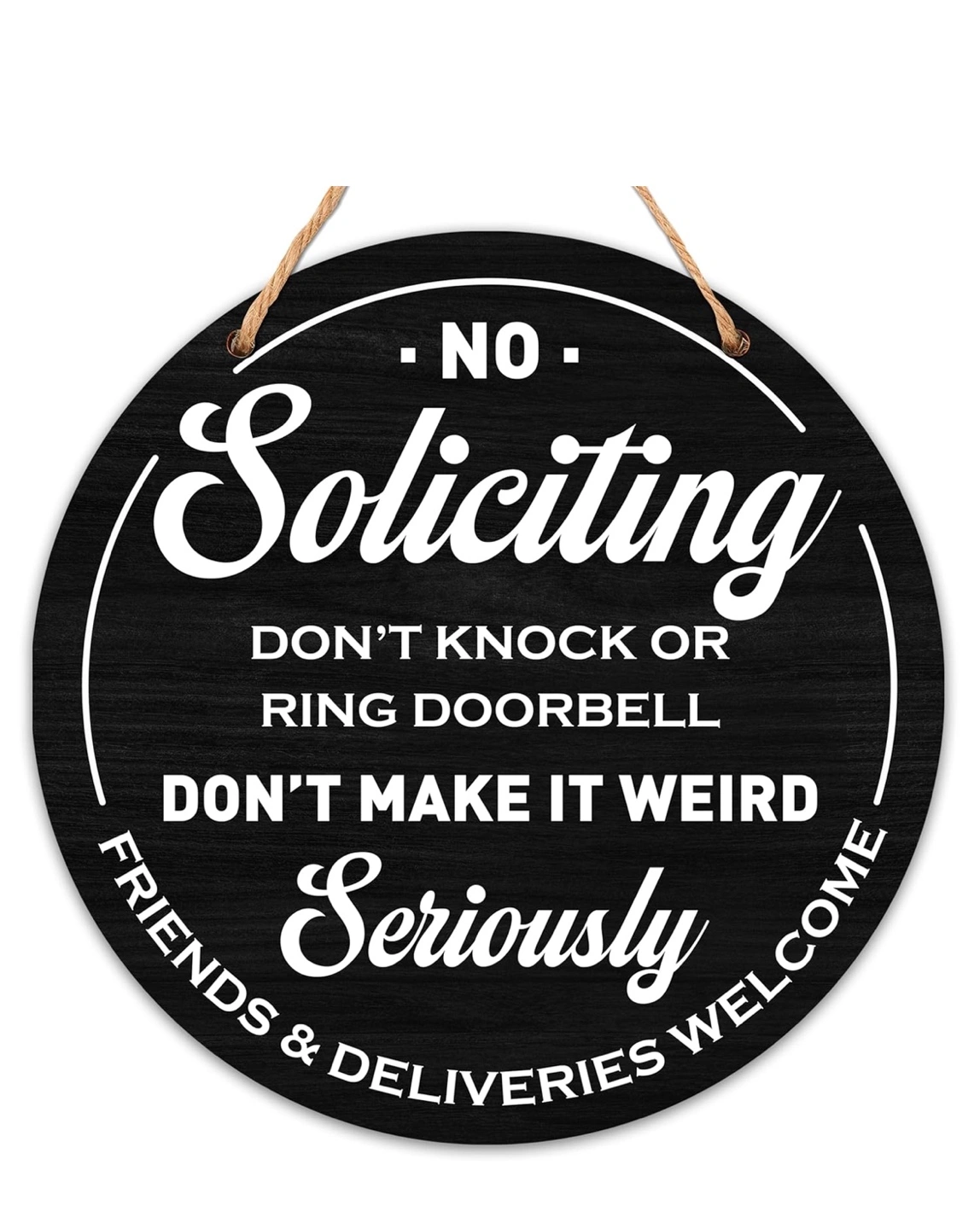 12-inch round wooden plaque. Black background with white lettering. Hemp rope for hanging. Perfect for office, living room, bedroom, or shelf. Says "No Soliciting" with additional text.