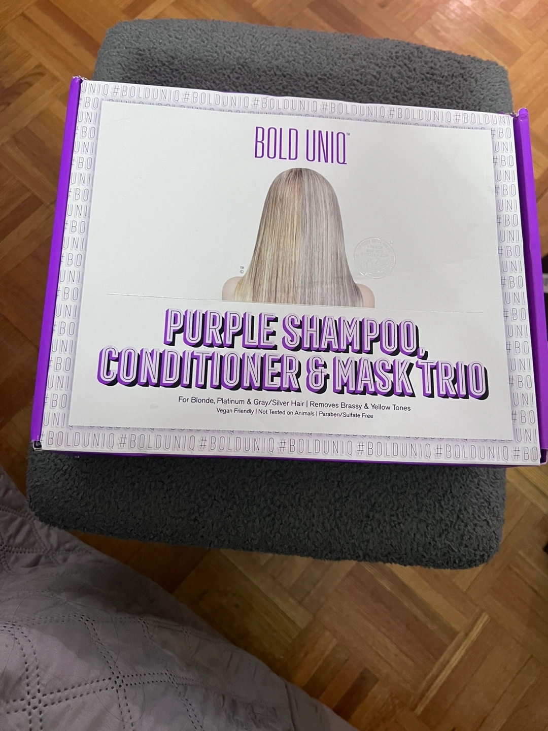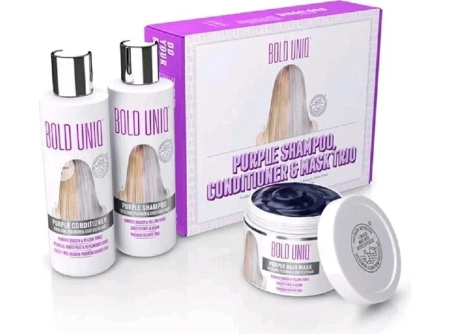 New, sealed Bold Uniq purple shampoo, conditioner, and mask trio. Perfect for blonde, platinum, or gray hair. Removes brassy and yellow tones. Vegan friendly and cruelty-free. Paraben and sulfate free.