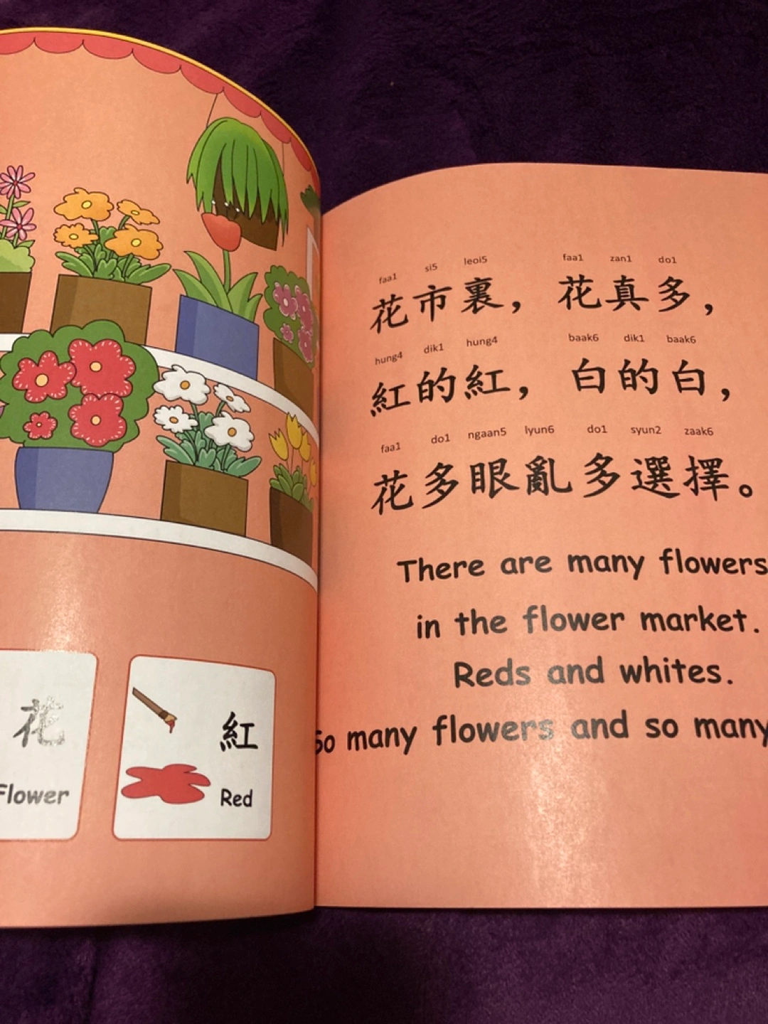 Cantonese rhyming book for children. Includes audio via QR code. Teaches vocabulary, numbers, colours, opposites, family, animals, transport and seasons. Bilingual edition: English and Traditional Chinese with Jyutping.